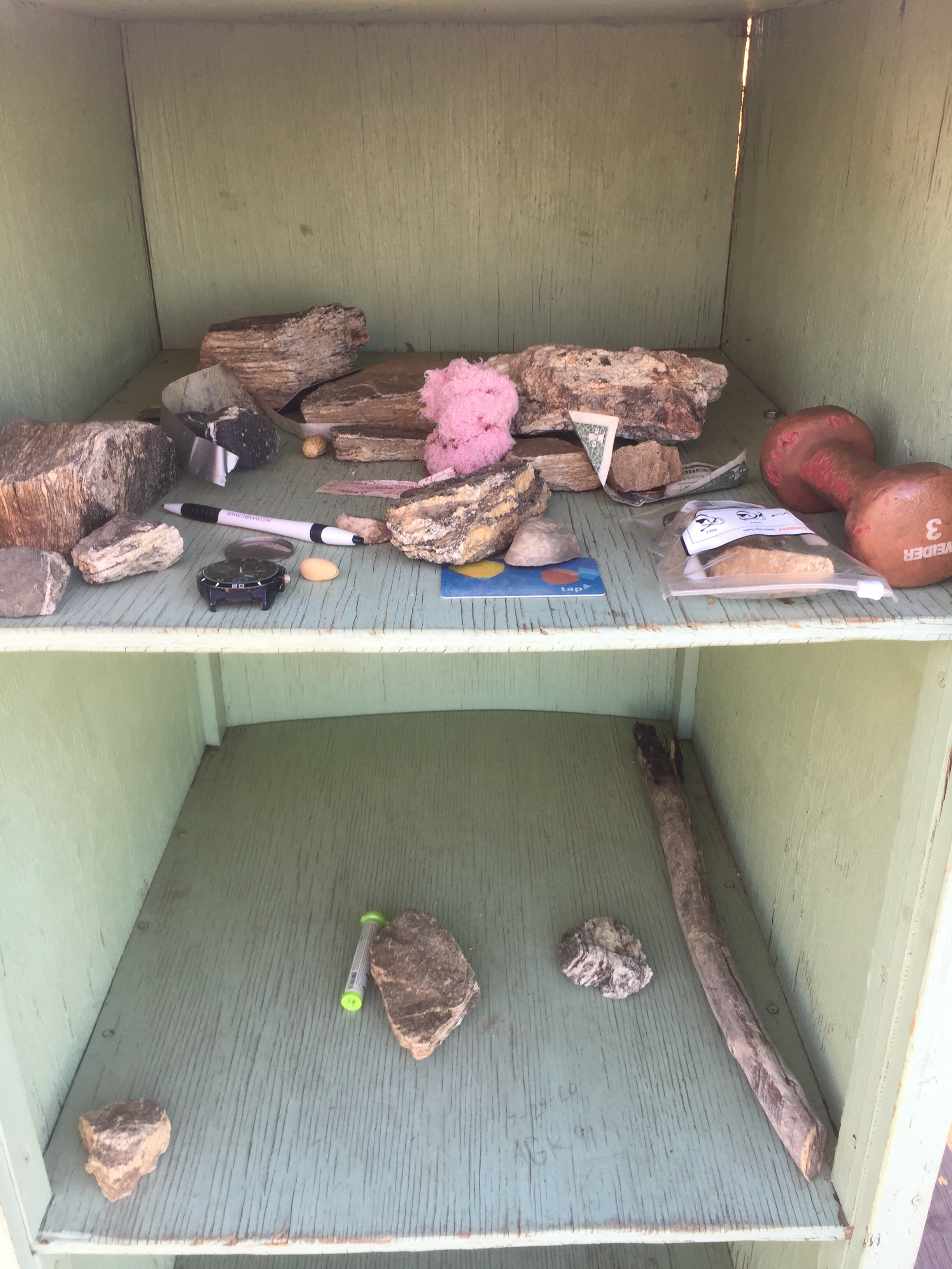 There is an odd standing bookcase deal on the top that was filled with cryptic mementos from other hikers. It made a good logging table even if there was no shade.