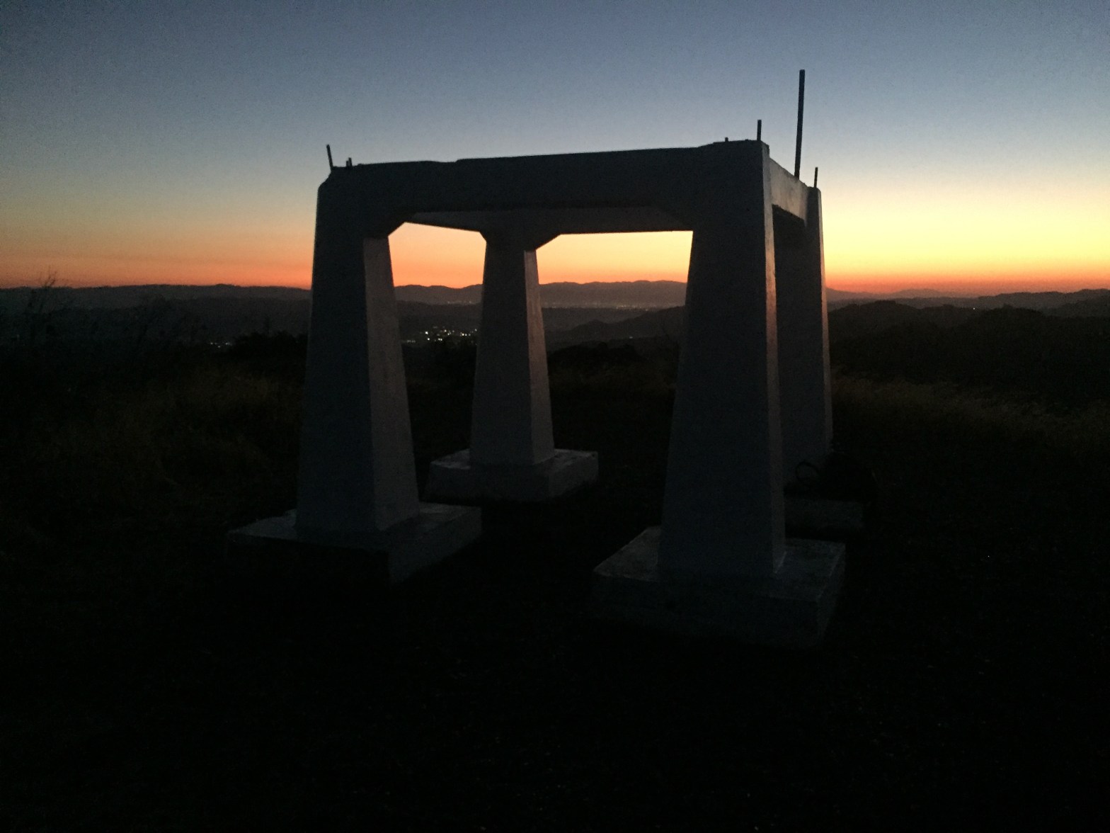 The remains of a fire lookout tower at dawn. The San Gabriel Mountain in the background.