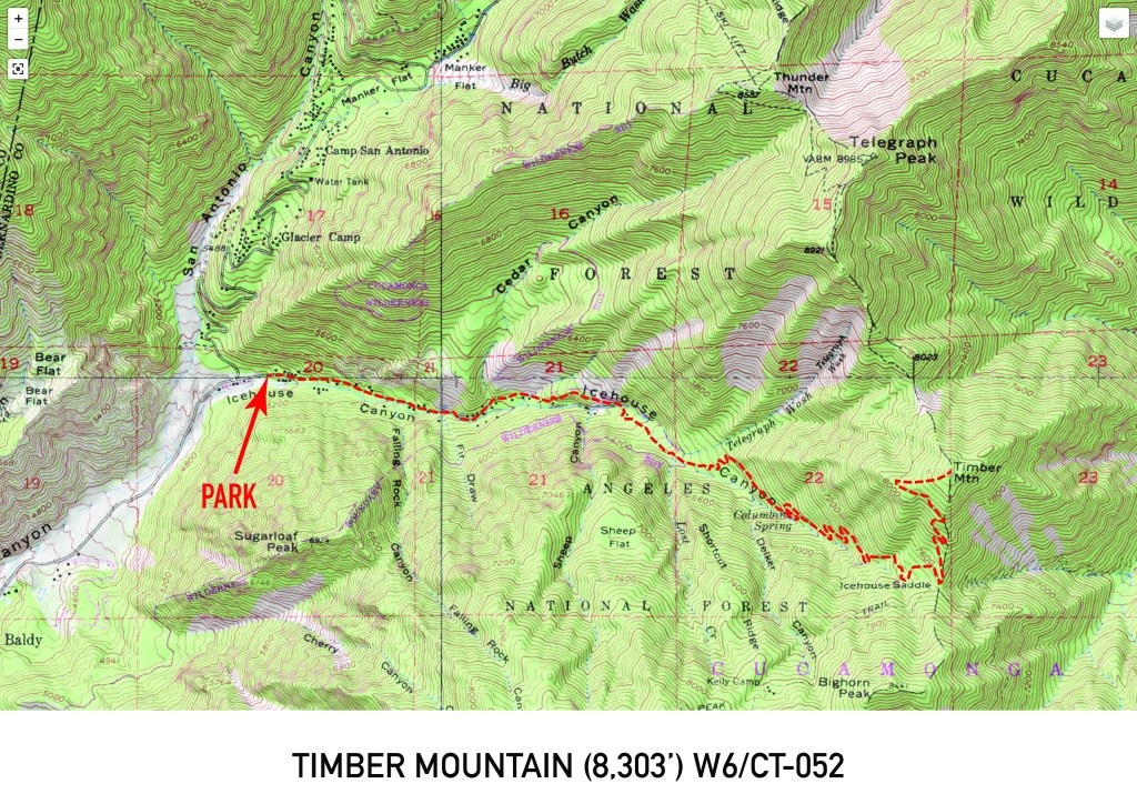 Brian (WA6JFK) and I were planning another pair of tandem activations. Sunset Peak was a good choice for a moderate hike, but what other juicy peak was nearby? I had climbed Timber Mountain twice before – once in 1981 and once in the winter of 1999. At 10 miles round trip and over 3,300′ of elevation gain, it poses a challenge to my current level of conditioning. I decided that’s a good thing!