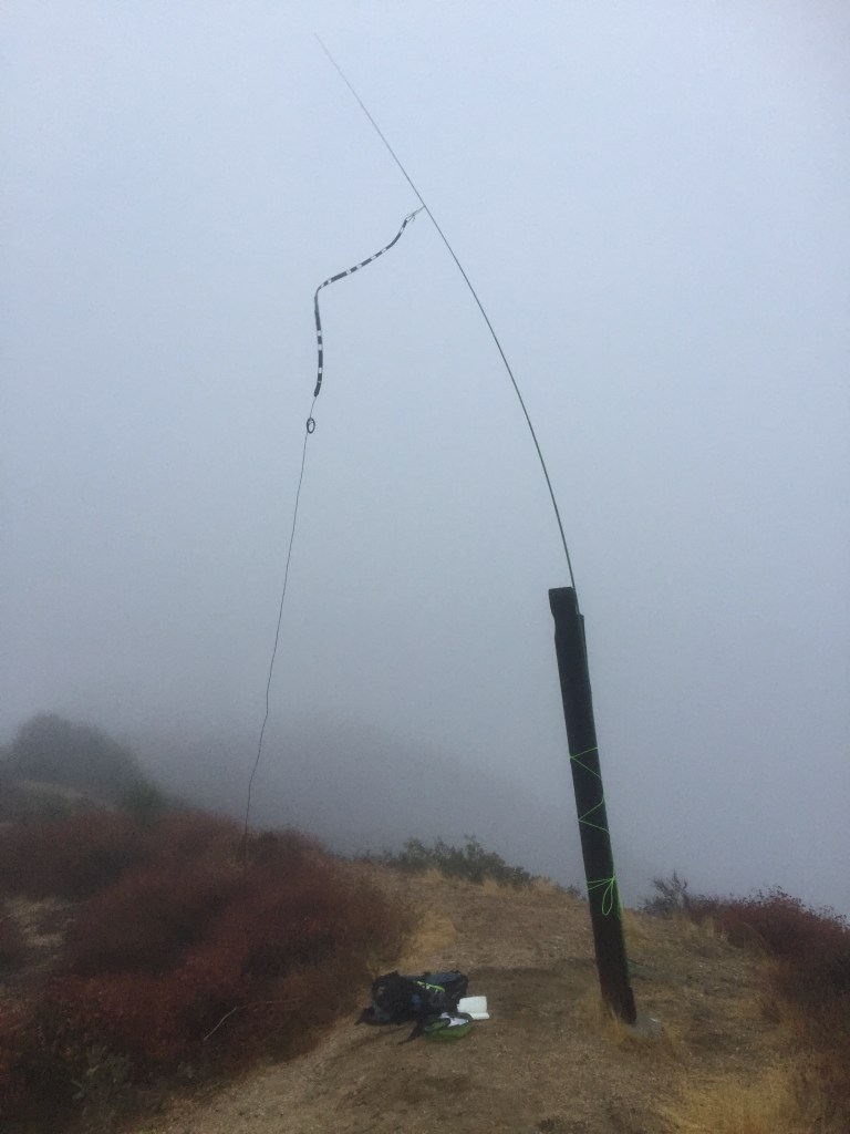 There isn’t much to say about the “hike” up this summit. You can park in the activation zone. A short walk past the locked gate to the right brings you up to a large level area with some burnt wooden poles that make good mast anchors. I chose a day when it was forecast to rain – the first winter storm of the year. The weather was cold, wet and miserable as expected. I made 5 contacts as my hands froze in a driving rain that was turning sleety. One was with Glenn KK6KEA in Green Valley who was surprised to hear anybody. He said they don’t even have cell service. Cell service from Verizon was good on this summit. Brian WA6JFK made contact just as I was bailing.