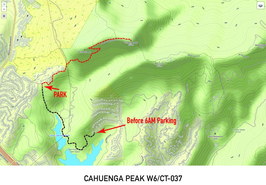 My friend Brian WA6JFK had activated this summit recently and he told me where to park. When I got to Lake Hollywood Drive I discovered there are parking restriction before 6 AM that forced me to park a mile further away and add over 200′ to the climb.