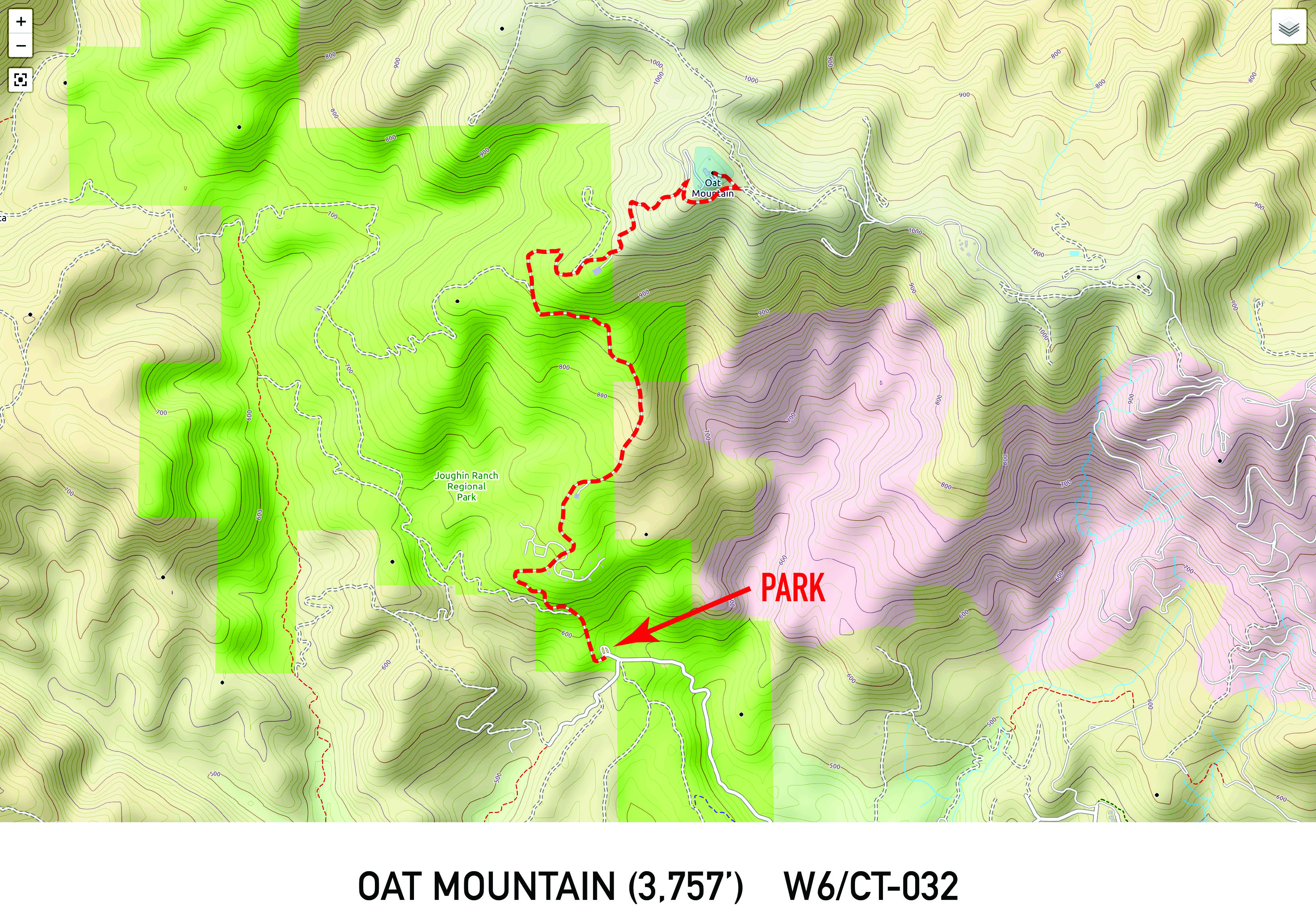 I can see Oat Mountain from the window of my radio shack window here in Topanga. It’s easy for me work repeaters on Oat with 500 mW and a rubber duck. My last hike up there was 24 years ago back when it was all private property. Now there is a route up Brown’s Canyon through the Joughin Ranch at Antonovich Park that is on Mountains Recreation and Conservation Authority (MRCA) land. This is at the north end of DeSoto in the San Fernanado Valley. The actual summit is privately owned but there are accessible spots in the activation zone.