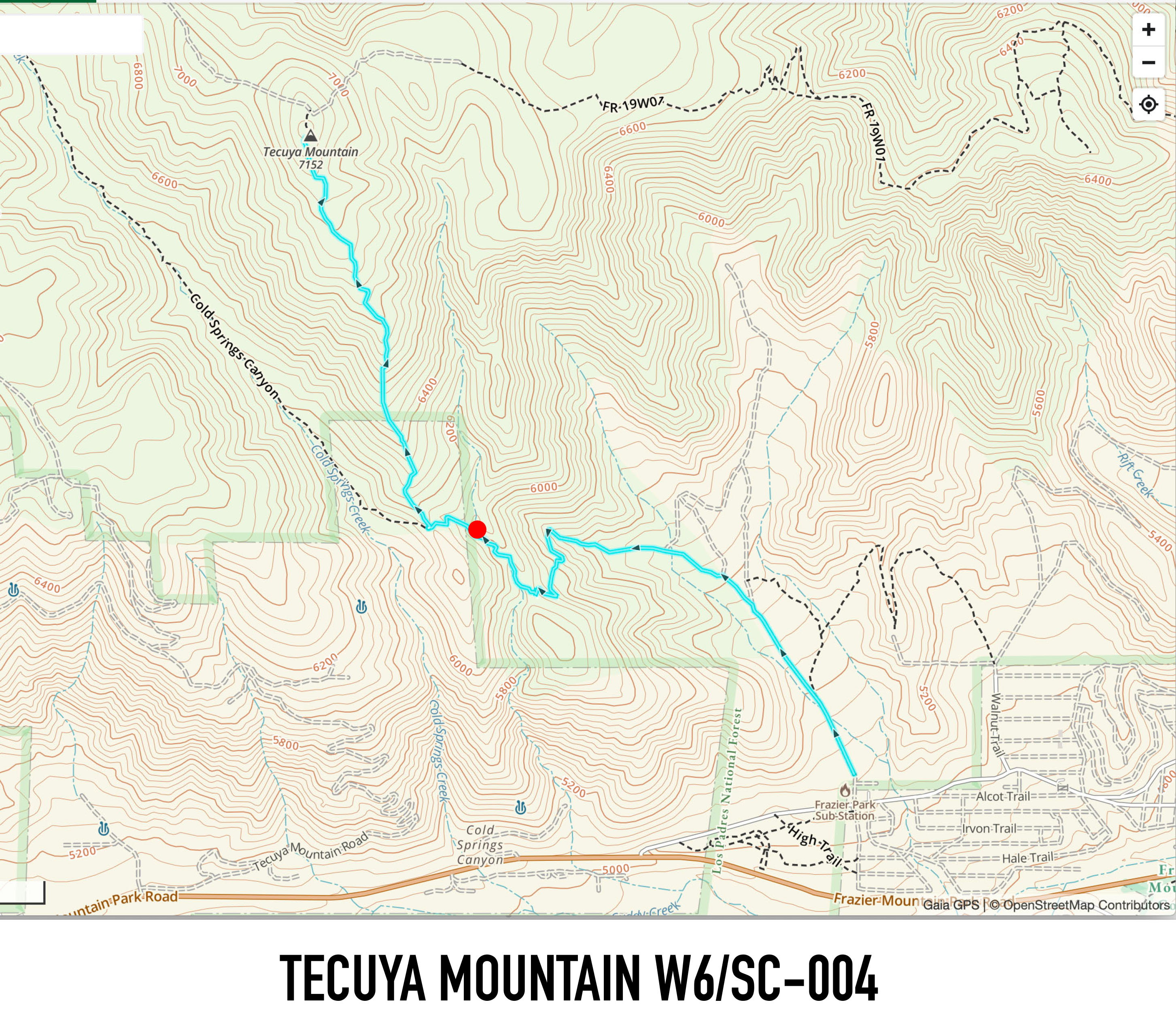 My last trip to this mountain was on June 15, 1995. I drove to the summit in Cassie’s Mom’s Blazer. With all the mountain roads closed, I selected a route that starts at the end of West End Drive in Frazier Park. I left the car just before 6:00AM in the dark and made my way up the road. This is a heavily eroded route due to it being open to motorcycles and ATVs in the non-winter months. At about the 1.2 mile point (red dot on the map below), I foolishly decided to take a trail that follows the ravine up thinking this might save some elevation loss. Turns out it just added a half mile and was tricky picking a way cross country to the ridge. I recommend staying on the trail. I came back that way and there is no elevation loss.