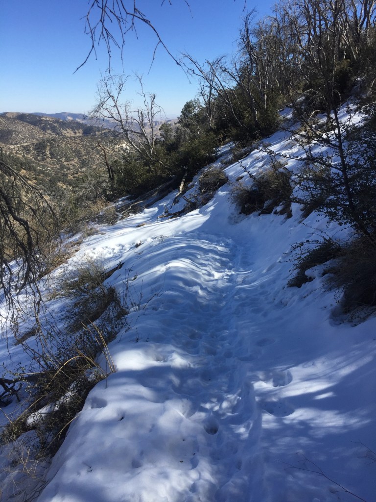 The trail was pretty snowy on the north side of things and completely clear on the south. I didn’t have traction control spikes or gaiters, but didn’t really need them. Conditions are what I would expect for the winter months. Perhaps the best thing was that I didn’t see anybody else on the entire trip until I was almost back in Frazier Park. Since I haven’t received my first Covid vaccine, this was a two-fold blessing.