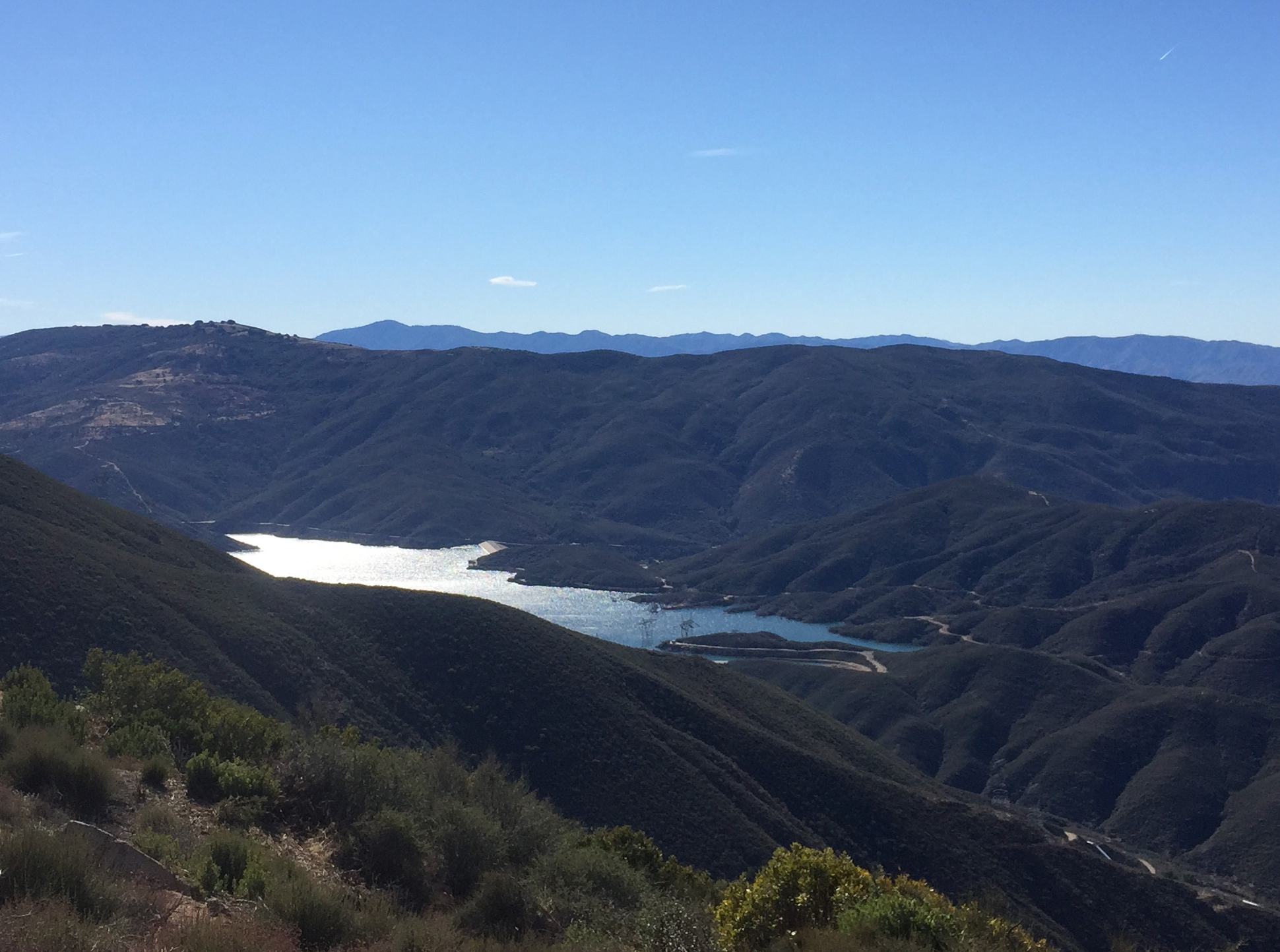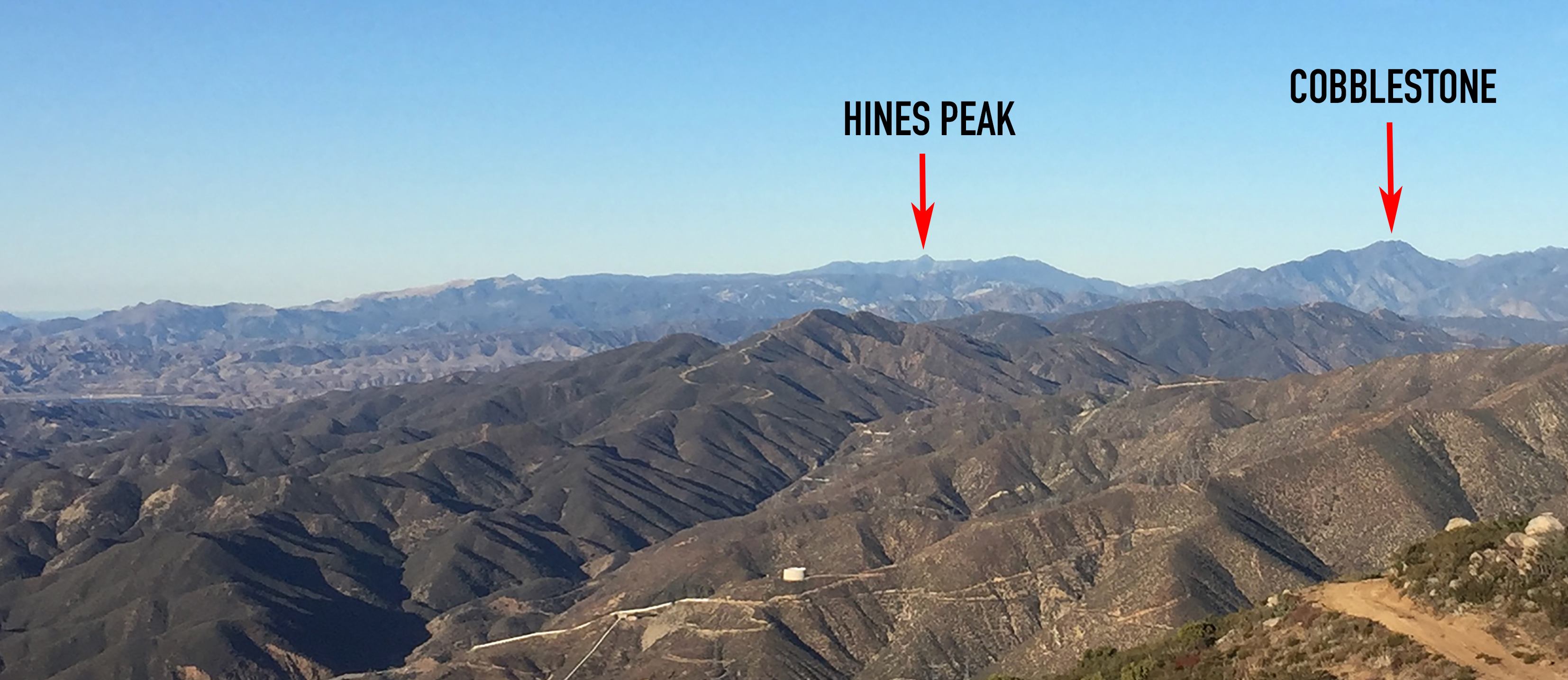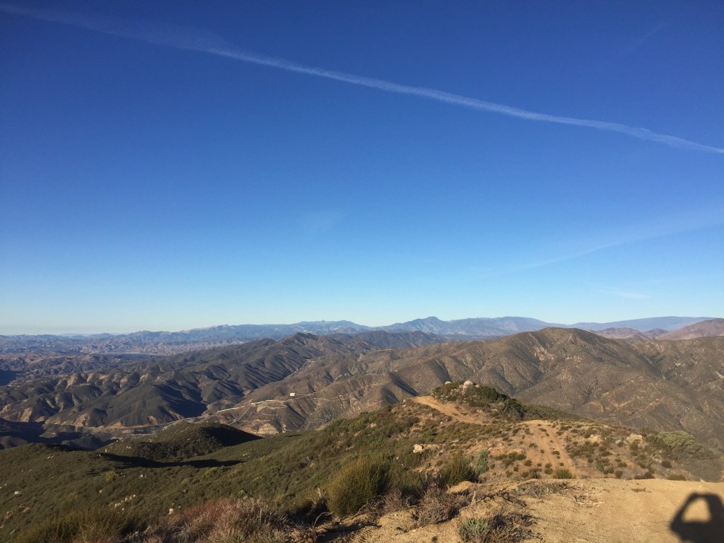 Looking south across the Santa Clara River Valley. Saddle Peak and Sandstone Peak in the Santa Monica Mountains are visible