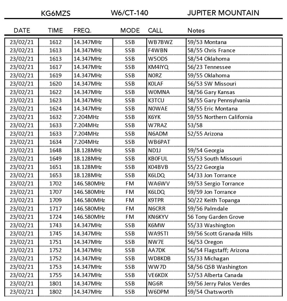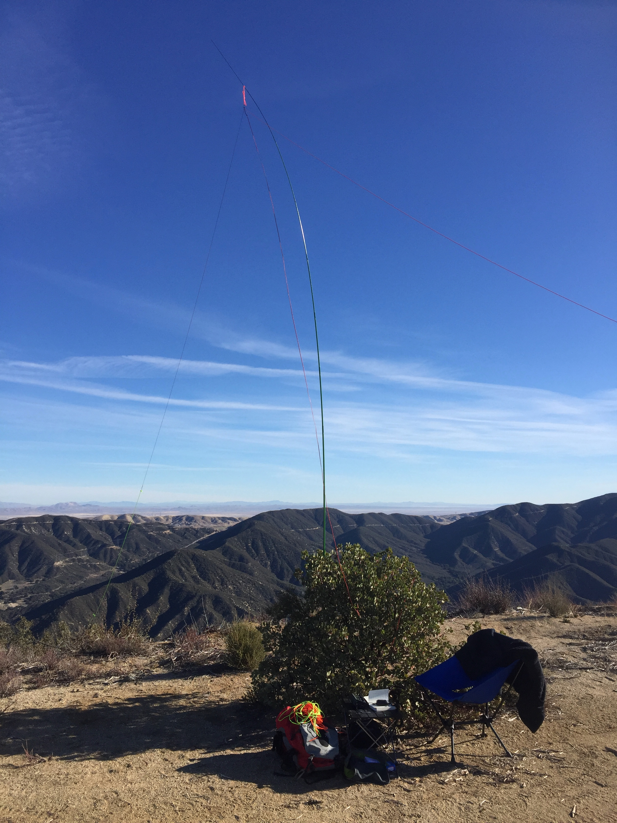 The top is a broad summit that has recently been scraped of brush. Fortunately there was a manzanita bush in full flower that made an excellent anchor for my Goture 24′ carbon fiber fishing pole mast. When I got there a humming bird was ravaging the nectar from the flowers and was not too thrilled to have company. She kept buzzing my head as I called CQ.