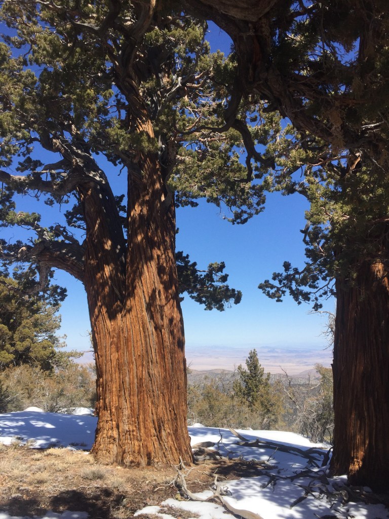 The hike is about 3 miles to the summit with over 1,000 feet of elevation gain. I lost the old jeep trail a few times on the way up due to the snow and the scrub oak and other brush caused me to meander a bit. The hike goes through an amazing forest of ancient juniper trees. These incredible beings live for over 500 years. Judging from the size of some of the trunks I passed, I’m guessing some were close to 1,000 years old.