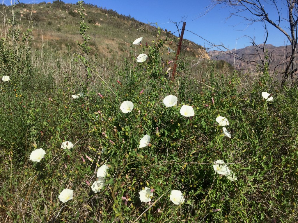 This is a really easy hike: a little under a mile and only about 300 feet of elevation gain. The area had burned over two years ago in the Woolsey Fire, but many of the Coastal Live Oaks (Quercus agrifolia) are recovering nicely. As I made my way up the gently graded trail in the first light before dawn, I could see dozens and dozens of white White Morningglory flowers marking the edges of the trail.