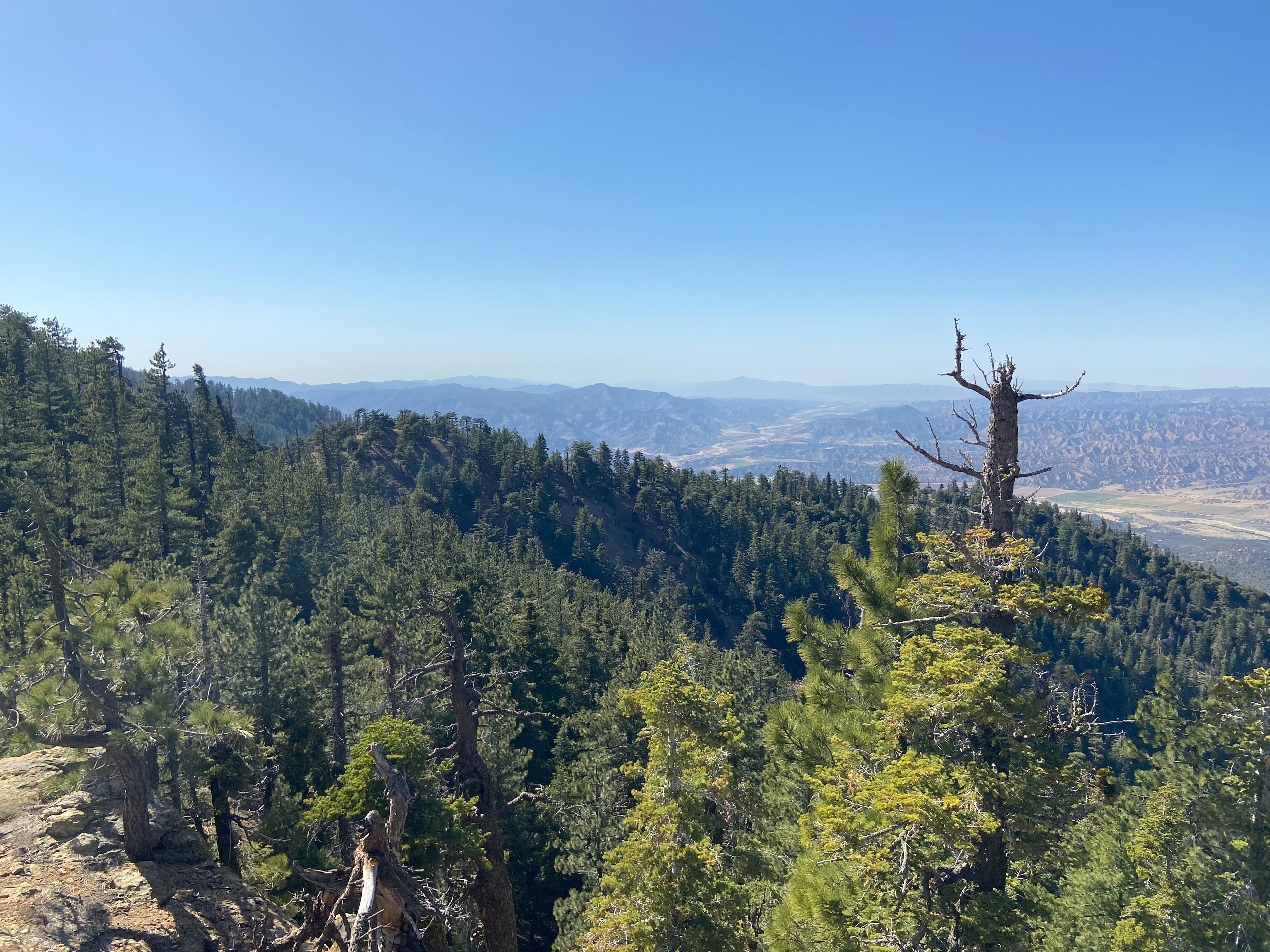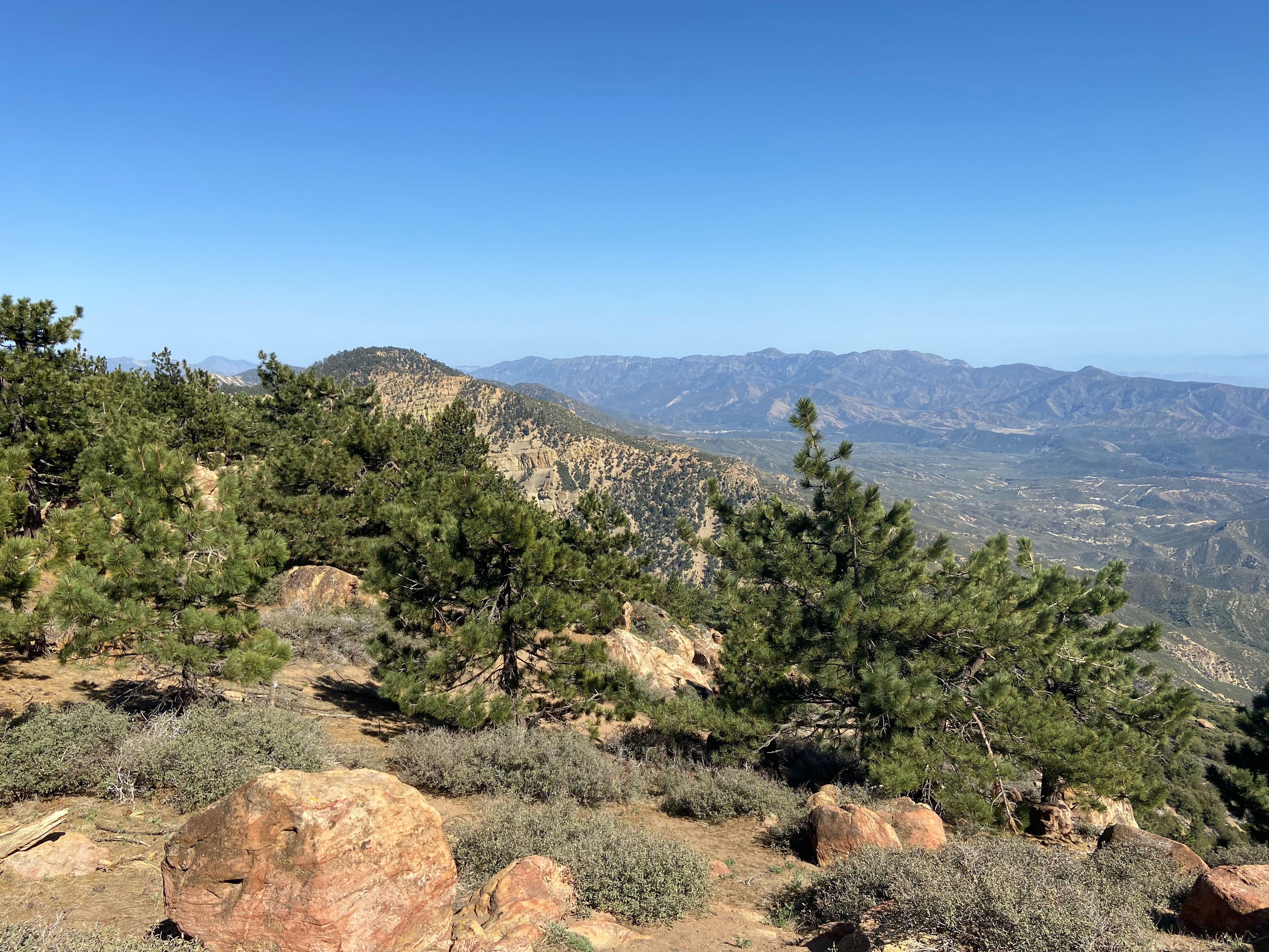 I first climbed Reyes Peak on April 25, 1981. I went back and did it again on the way to Haddock Mountain with Cassie KG6MZR and my faithful mountain dog, Chauncey Gardner. On this trip, the view of the Cuyama River Valley and Mount Pinos/Sawmill/Cerro Noestre to the north was quite clear. It was hazy to the south but there were great views of Hines Peak and the Topotopo Ridge, Ortega Peak and even breakers south of Ventura and Diablo Peak on Santa Cruz Island. Haddock Peak dominates the east with a nice view of Cobblestone Mountain just peeking through the trees.