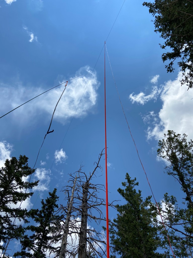 The first thing I discovered about this mast is that it is considerably harder to set up. It didn’t help that the spot I picked had a lot of deadfall from the Cerro Grande fire of May 2000. My brother Mark (the physicist) likes to say: “The perversity of inanimate objects tends to a maximum.” My late father (the artist) would say: “If a piece of string can get tangled, it will.” That was the theme of this activation’s setup. The AWG 20 wire of my doublet seemed to catch and snag on every branch within a 100′ radius. The unwieldy new 31′ mast seemed like a witching rod for any potential tangle. I’m usually pretty careful about laying out the wires and guys, but this activation defied all my careful prep. It probably took me an hour to set up the HF antenna.