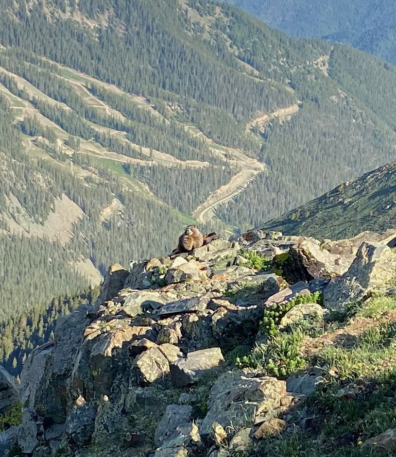 This time the new Lake Williams route took me a little over 4 hours to reach the summit. This route is a little longer than indicated on various maps. My track recorded about 4.5 miles with about 3,000 feet of elevation gain. I left the car at 4:45 AM as it was just getting light three days after the summer solstice. The trail cruises along until just after the Williams Lake turnoff and then it begins to climb in earnest. I saw a couple of marmots and pikas on the way up. One pika was very close to me industriously chewing off stems of the alpine grass to make her nest.