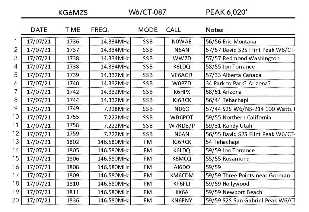 Between both peaks I had 33 contacts, including 3 different summit-to-summit contacts with KN6FNY. Kevin did 5 mountains this day. I had 6 total S2S contacts including two with N6AN on “David’s Summit” (formerly Flint Peak). My furthest contact was Chris F4WBN in France.