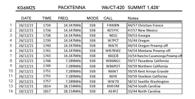 Radio conditions were pretty poor. With the preamp on the KX2 my noise level was about S9 on 20m, so I had to turn it off after a while. I forgot to repack my Kenwood TH-F6A on this trip, so no UHF/VHF. Sorry local chasers!