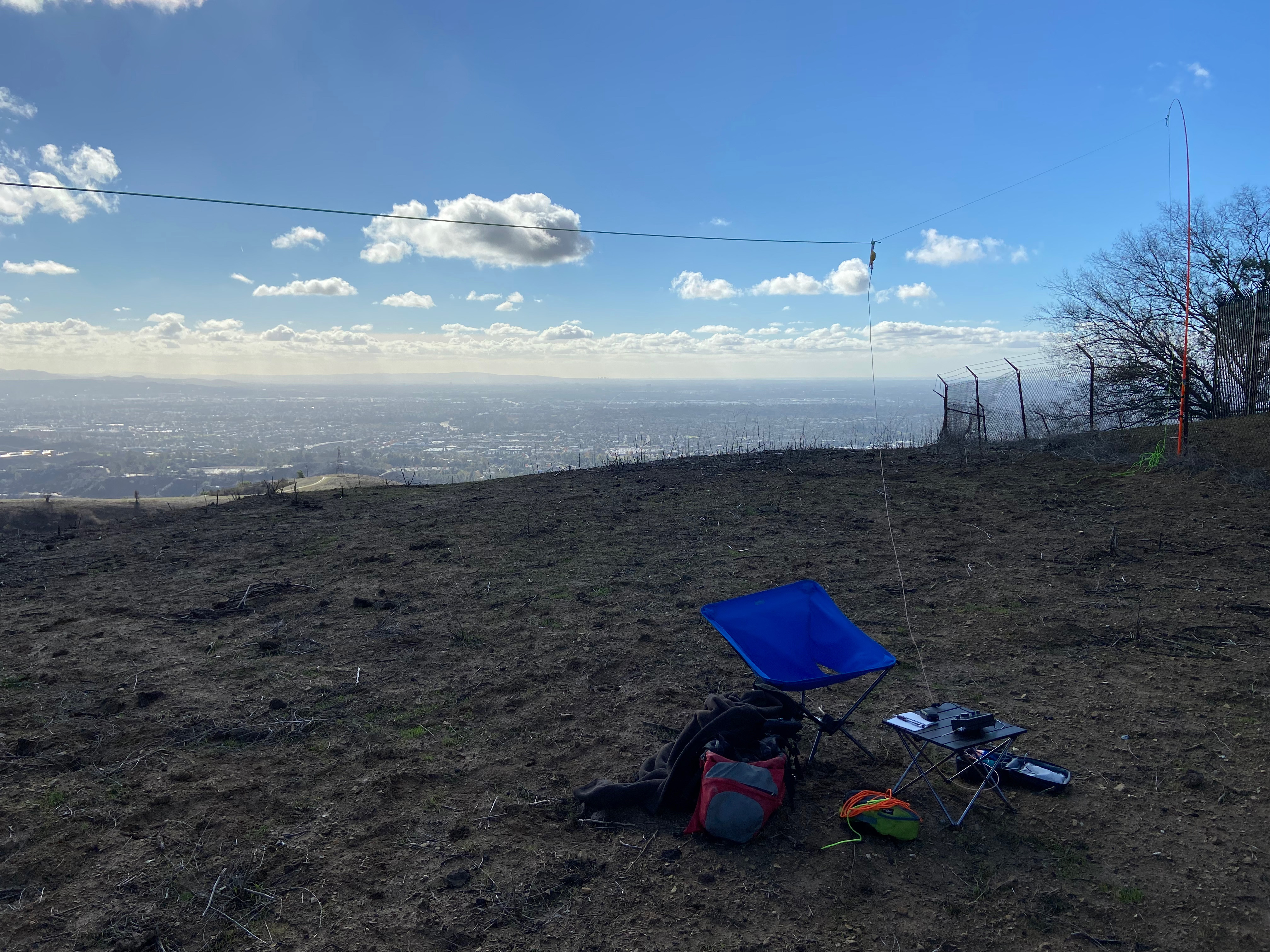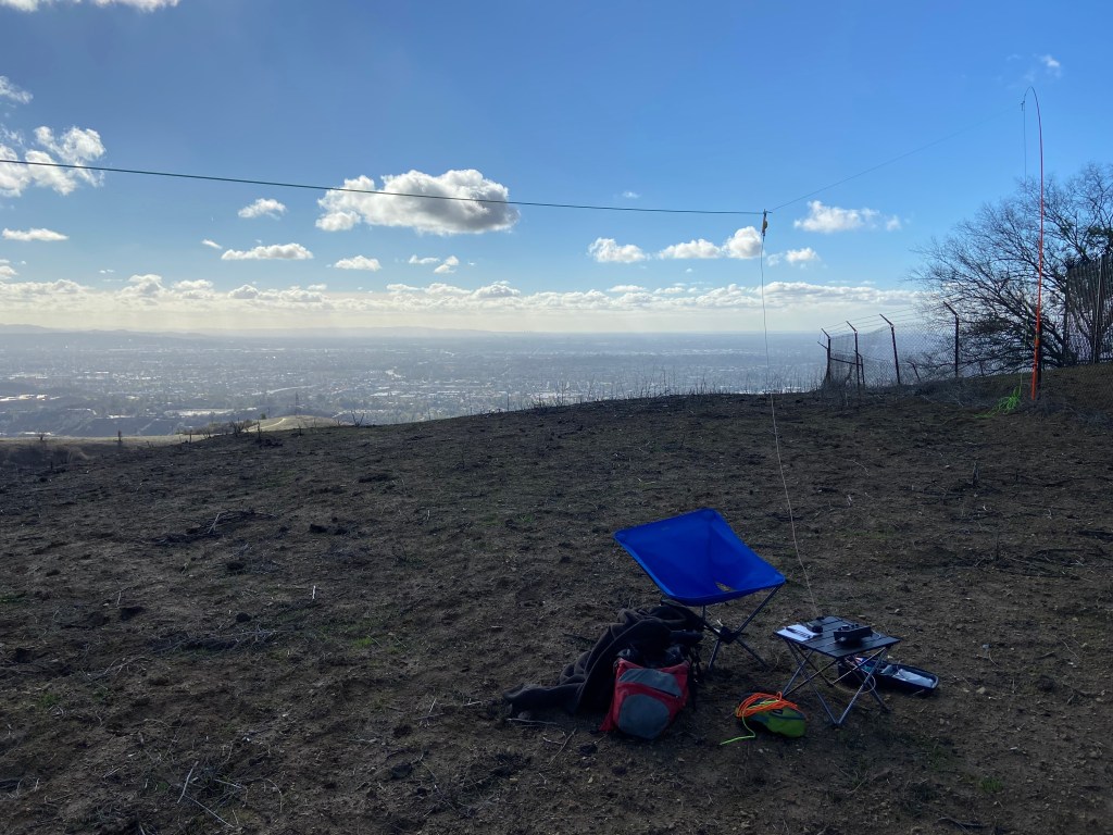 The hike is a short half mile up the paved road to the substantial radio facility on the summit. There are PRIVATE PROPERTY NO TRESPASSING signs but everybody in the neighborhood seems to walk their dogs up there. While the paved road did reach the activation area, the site I chose to set up was just to the east of the actual summit. There was one fence to climb over and cattle are run on the other side. I saw some longhorns and heard them lowing while I set up. The field I set up in was thick with a squishy adobe mud from the rains and care was needed to avoid the numerous cow pies.