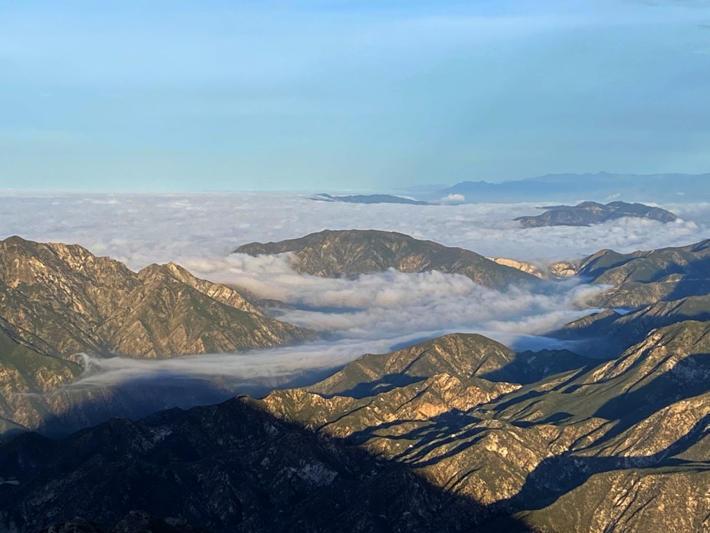I like the idea of a healthy hike so I decided on the 4 mile trip up Josephine Peak. The junction of Angeles Crest and Angeles Forest Highways was above the fog and a nice waning crescent moon lit my way up the initial part of the hike. Temperature was perfectly cool unlike my last trip up this mountain when the mercury soared into the triple digits. There was also a waning crescent moon in the sky on that late summer hike. I noted how much lower that same crescent moon was in the sky for this early spring hike.