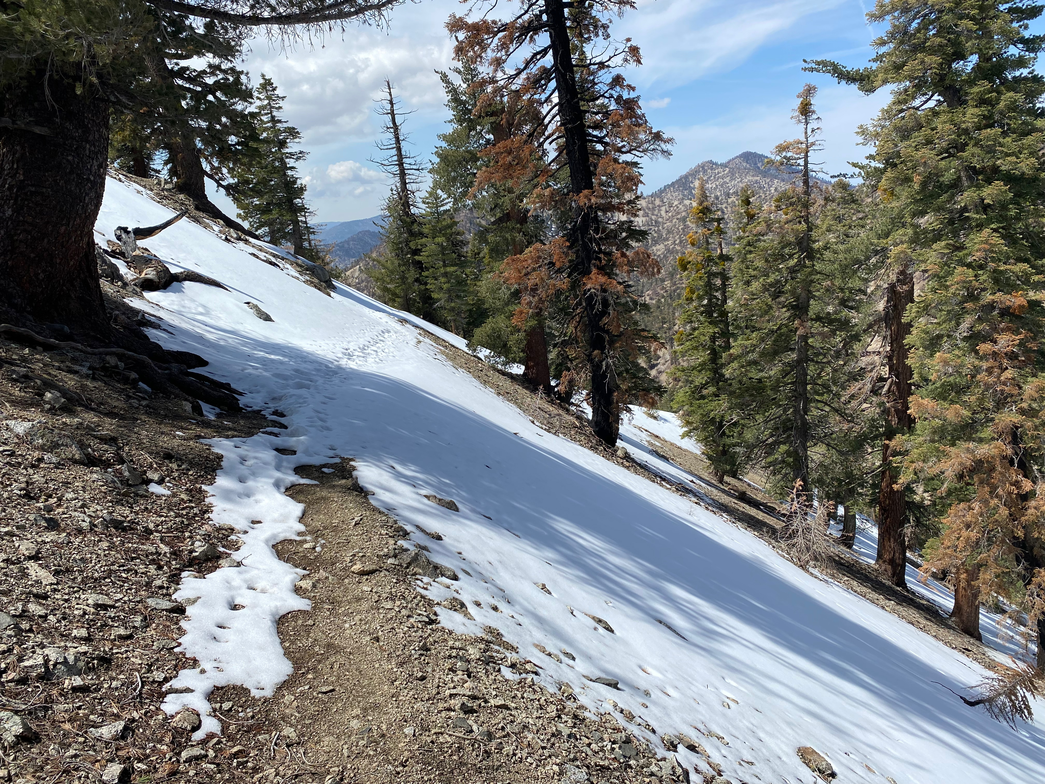 As it was just getting light I looked up at the burned out, but snow-free southern exposures of Mount Williamson and I decided to leave the micro-spikes at the truck. Big mistake! As luck would have it, the trail winds around to the north west side of the ridge and large, steep and icy sections of snow needed to be traversed. Fortunately somebody had come down late in the day before and large deep footprints were in the icy traverses. Where there were no steps I could kick footholds with 5 or 6 kicks in the icy snow. That and having my trekking poles tipped me over the edge in my decision to continue. A fall probably wouldn’t have been fatal, but it would have been serious nonetheless.