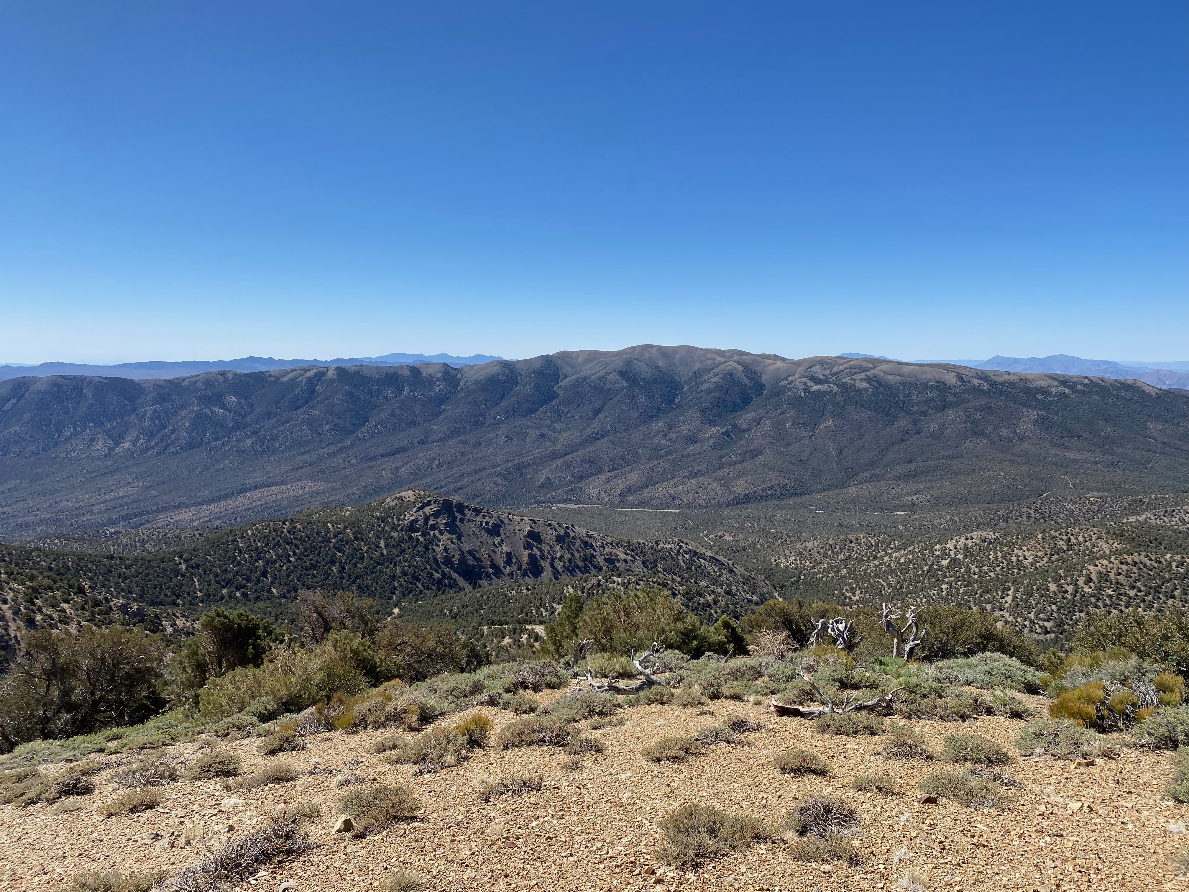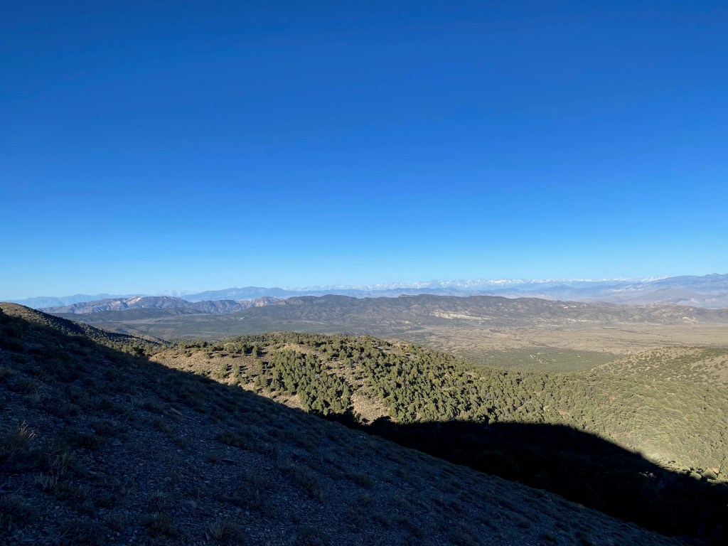 The Sierra Nevada crest from Palmetto Mountain. Split Mt. is the prominent peak in the center. The Palisades to the right.