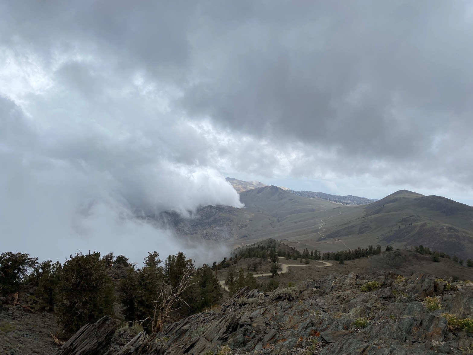 Looking north up the White Mountains with some serious weather moving in. 10 SEPTEMBER 2022 W6/WH-008 Elevation: 10,940′ Route: Use trail and cross country Hike Distance: .3 miles round trip Elevation Gain: 150′ Navigation: Easy Steepness: Moderate Vehicle: Passenger car Road: Good dirt road Cell Coverage: None (Verizon), APRS Excellent Hike basics After my frenziedContinue reading “Summit 10,940′”