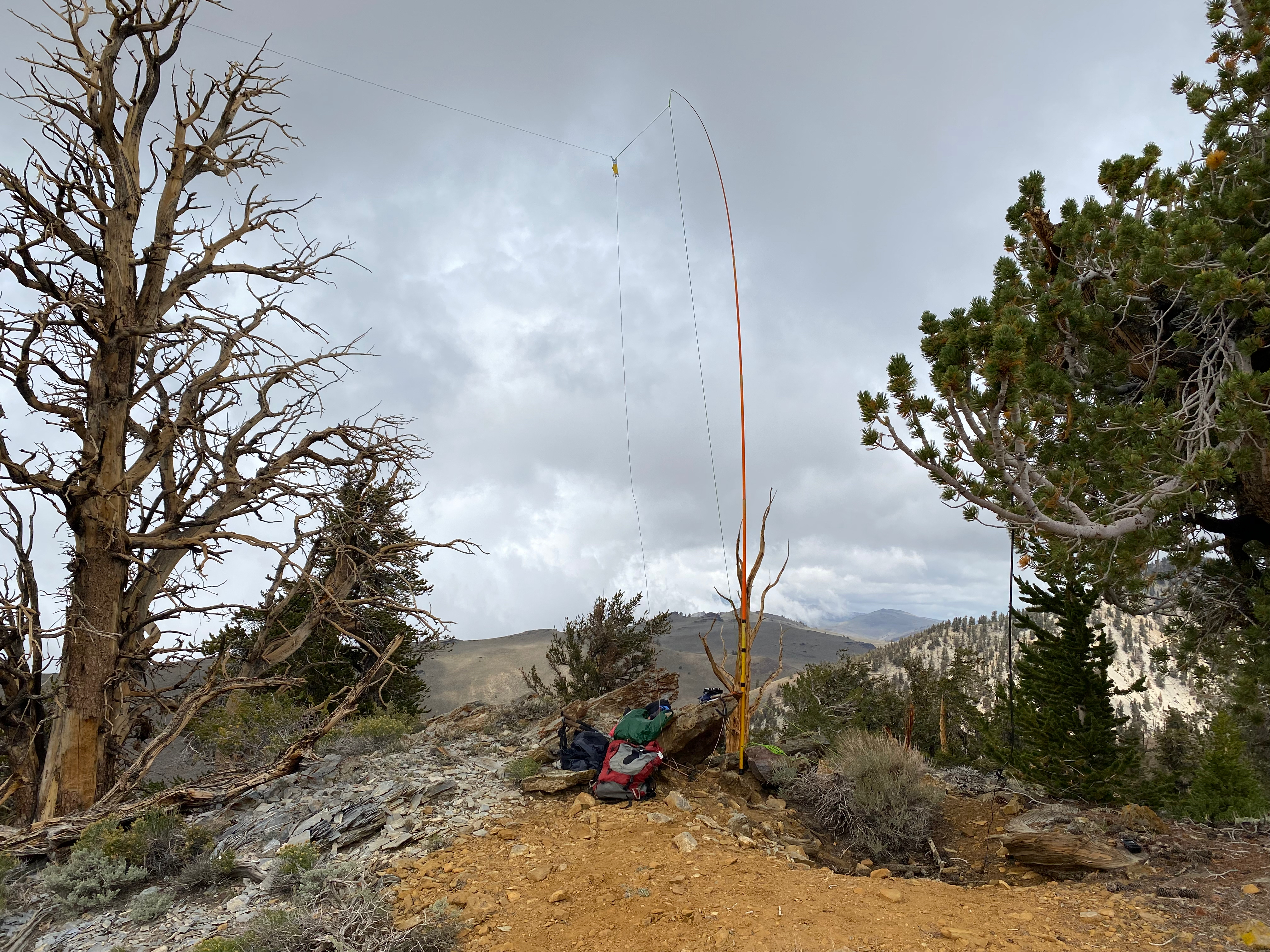 The hike is a short, moderately steep jaunt up a forested hillside. The route starts on an old mining road and goes past some ruins (see photo below). Once on the summit I quickly set up the station only to have the skies over the Owens Valley to the west get darker and darker. When the thunder got louder and closer, I quickly tore the station down and packed up. By the time I was ready to retreat down the mountain, the weather lightened up, so I got everything out and set it all up a second time!