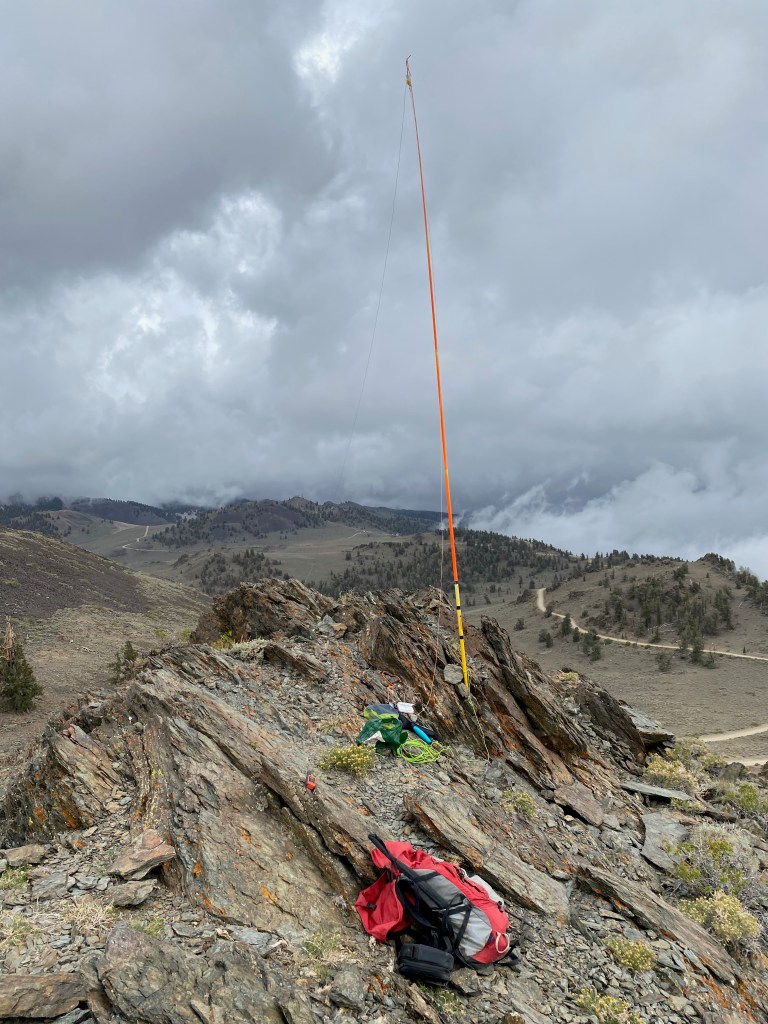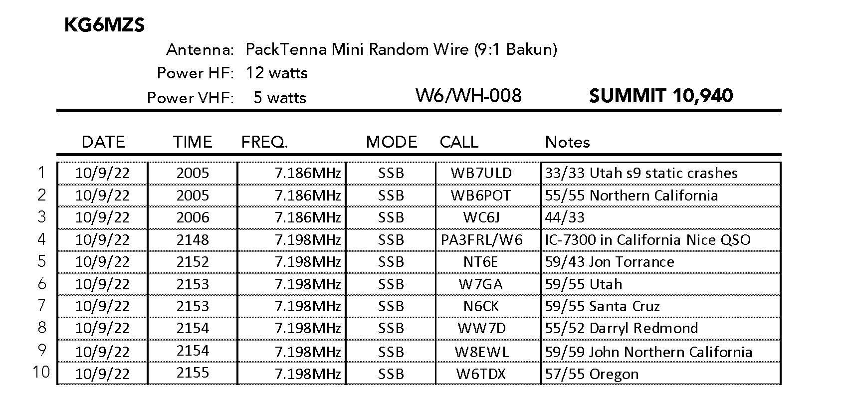 When I reached the high saddle next to summit 10,940′ W6/WH-008, I could see that County Line Hill was a good deal further down White Mountain Road and I decided not to chance it in the unsettled weather. The hike is a short scramble up the north side of the summit. I quickly set up the PackTenna and didn’t set up the table or chair in favor of brevity. It was starting to cloud up again. There were HUGE static crashes on 40m. I made 10 contacts and started packing up as big fat raindrops started to fall.