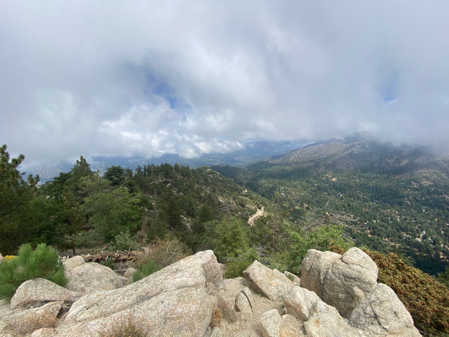 I first hiked this inauspicious HPS summit on March 22, 1997. It is a pleasant walk through the pines with a decent view on a clear day. It was cloudy on this day and the cumulus clouds did graceful dance around the summit. Thomas Hunting Grounds Road was in good shape with only one spot that I could easily drive around. This was after the freak tropical storm Hillary that dumped a record number of inches on southern California in late August. In 1997 I drove my Volvo sedan to the trailhead.