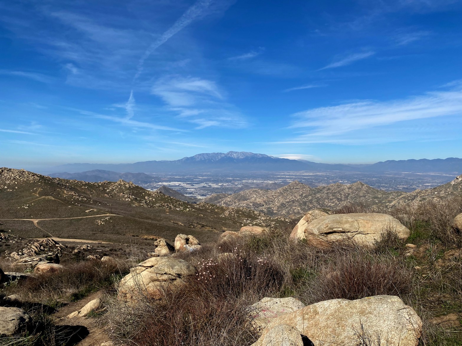 Terrific view of the big San Gabriel Mountains over their namesake valley. Baldy or Mount San Antonio is in the background. 13 JANUARY 2024 W6/CT-180 Elevation: 3,045′ Route: Good trail and access road Hike Distance: 4 miles round trip Elevation Gain: 700′ Navigation: Tricky Steepness: Extremely steep Vehicle: Passenger car Road: Paved Cell Coverage: Just belowContinue reading “Box Springs Mountain”
