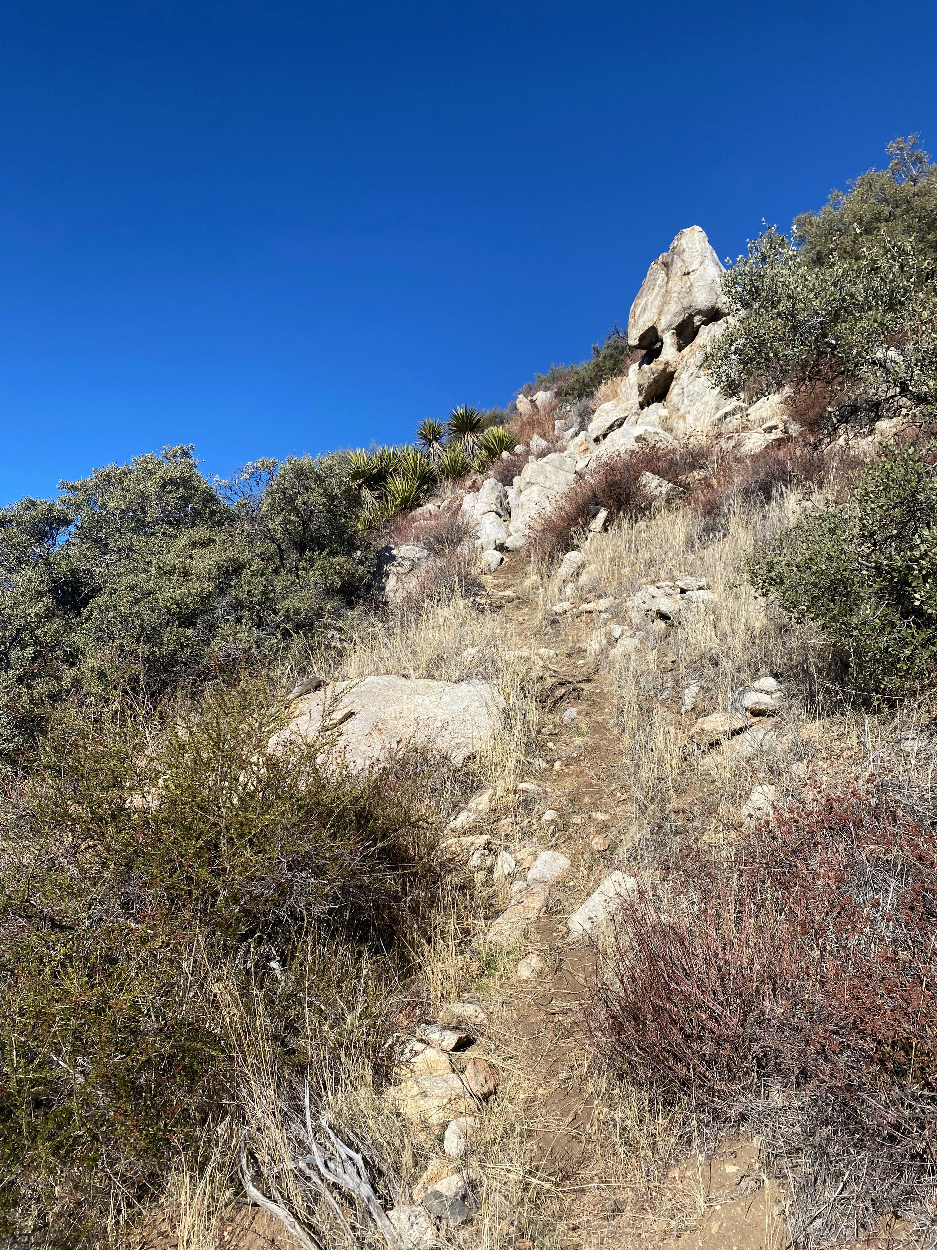I got a pretty early start and got to the trailhead just before 8am. It was a warm, dry, clear day with a general offshore flow to the airmass over Southern California. The Pacific Crest Trail leaves Highway 74 and heads up to a small pass through a forest of large Redshanks. The trail then descends 400 feet over the next mile or so to the gully where I left the PCT at 33.54859º N, 116.57528º W and headed up a pretty well defined use trail.