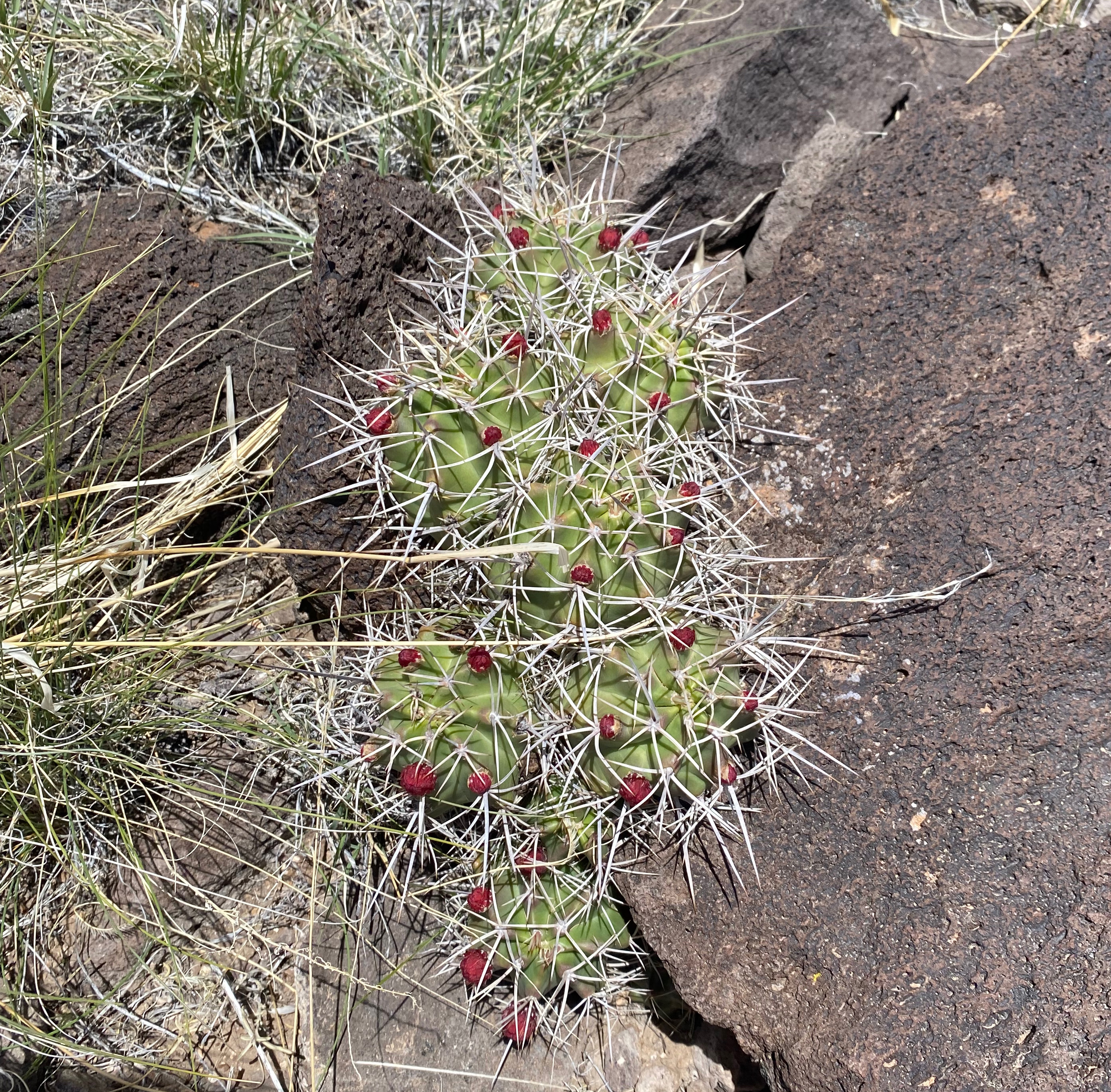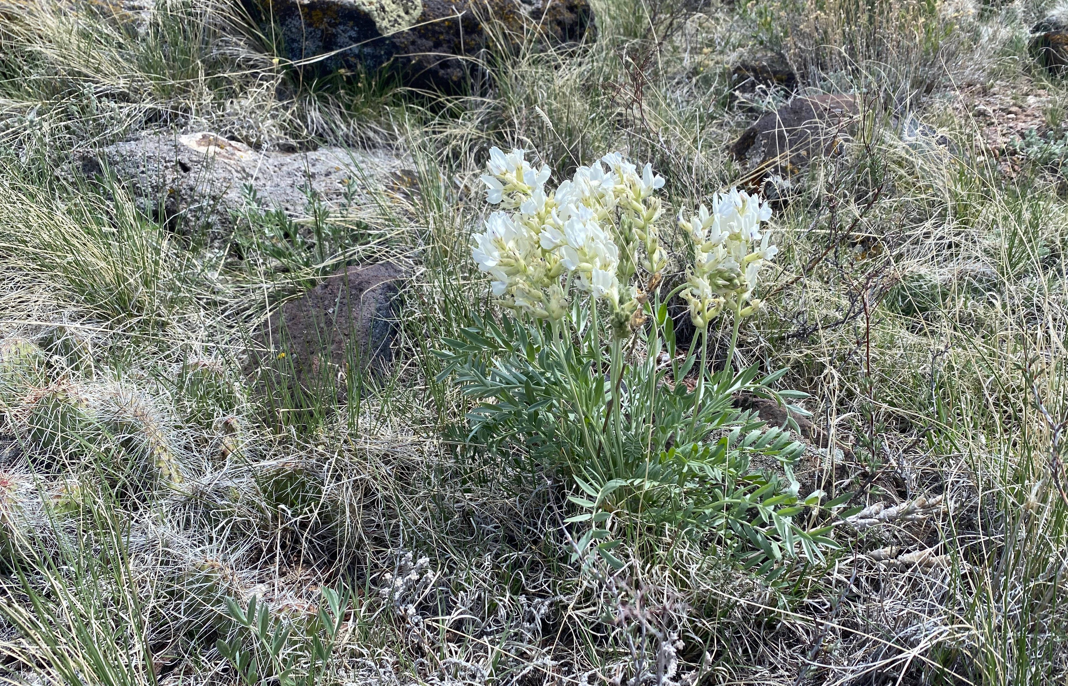 The wind that had started on Twin was becoming stronger. NOAA had forecast gusts up to 30 MPH and that usually means that or more on summits. The hike crosses over to private land from BLM land just after a false summit and the sturdy barbed wire fence can be stepped over on some large basalt blocks. There are no “no trespassing” or “private property” signs. What looks like uninteresting dun colored hills are actually alive with wildflowers and cactus upon closer inspection.