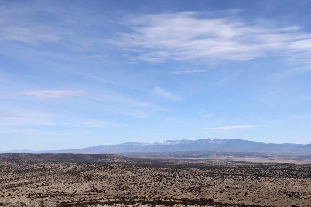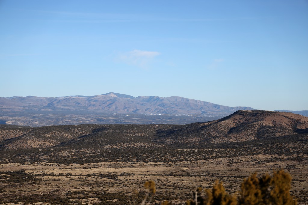 My new mountain romance is with the Caja del Rio Plateau, or simply The Caja. I set my sights on a new approach – from the south end. Fred KT5X says “there are no ‘roads’ to Tetilla Peak” and this is true. There are some tracks that get you close, but keep in mind Fred’s warning about the sharp volcanic rock in the area.