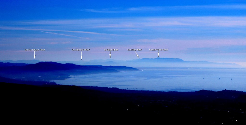 I was thrilled to get my very first-ever 2m SSB contacts on a summit. Longest was K1CT in San Diego. Icing on this particular cake was a 2m sideband contact with David N6AN on “Mount Hodge” (formerly Flint Peak). This QSO entailed dodging some pretty large piles of dirt, namely Sandstone Peak, Cahuenga Peak, Simi Peak, Conejo Mt., Calabasas Peak, and the Verdugo Hills (see photo below.). … and no activation is ever complete without Jon NT6E in Torrance, on 2m sideband no less!