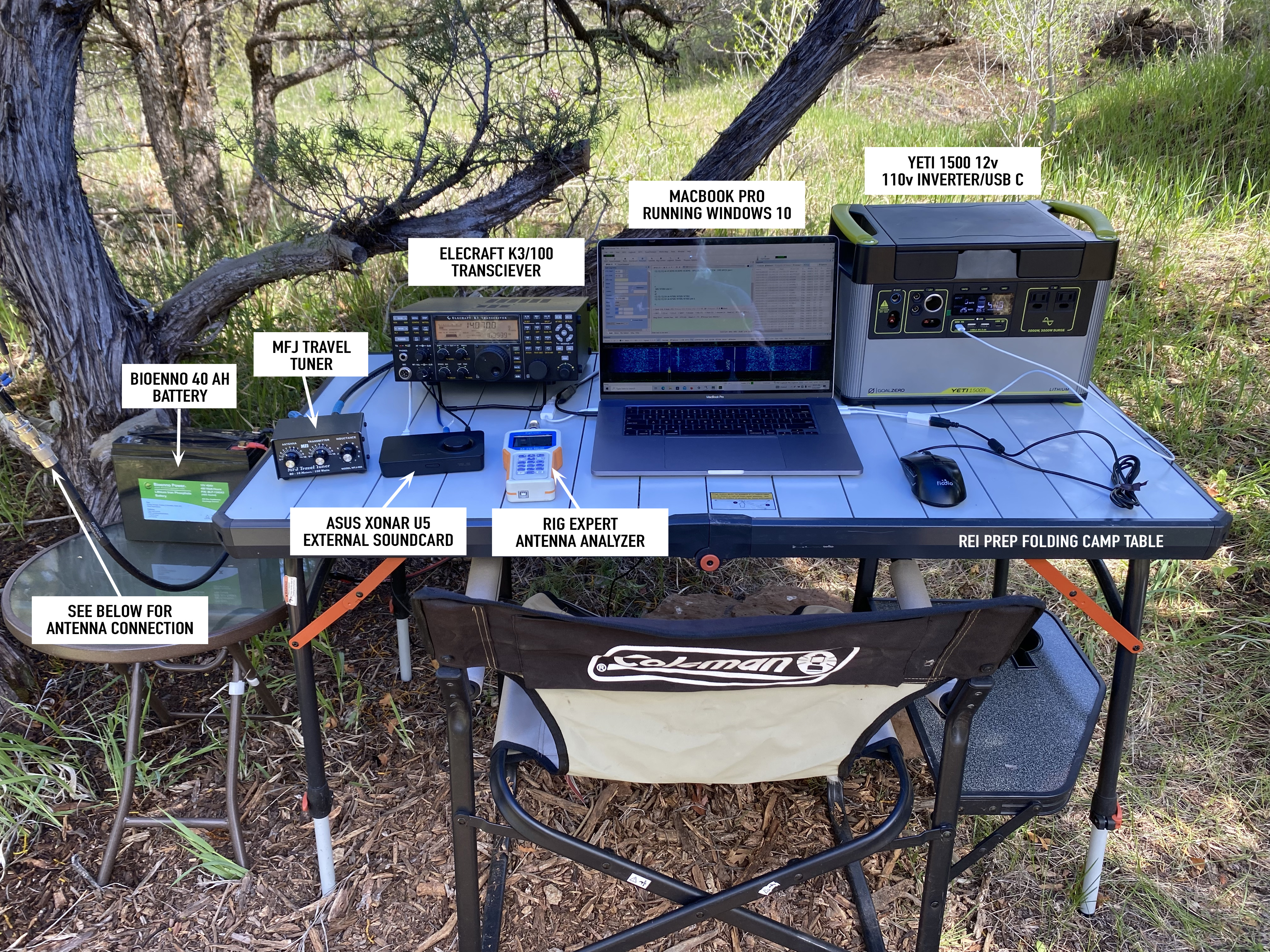 I carry two 12 volt battery banks – a Bioenno 40 AH LiPO and the Yeti 1500. Gone are the days when I carefully lugged around two flooded-cell marine batteries. The Yeti 1500 does a really nice job of powering the laptop. Laptop power was always a problem before because the charger for my laptops needed 110v AC. The Yeti has that, but be forewarned: the power inverter is really noisy on HF. It pretty much makes the waterfall unusable. Unless you buy a very expensive inverter this will be an issue and you will need to charge the laptop while you not on the air. The Yeti avoids that by offering a USB C connection at 60 watts. This unit charges fast and lasts for days.