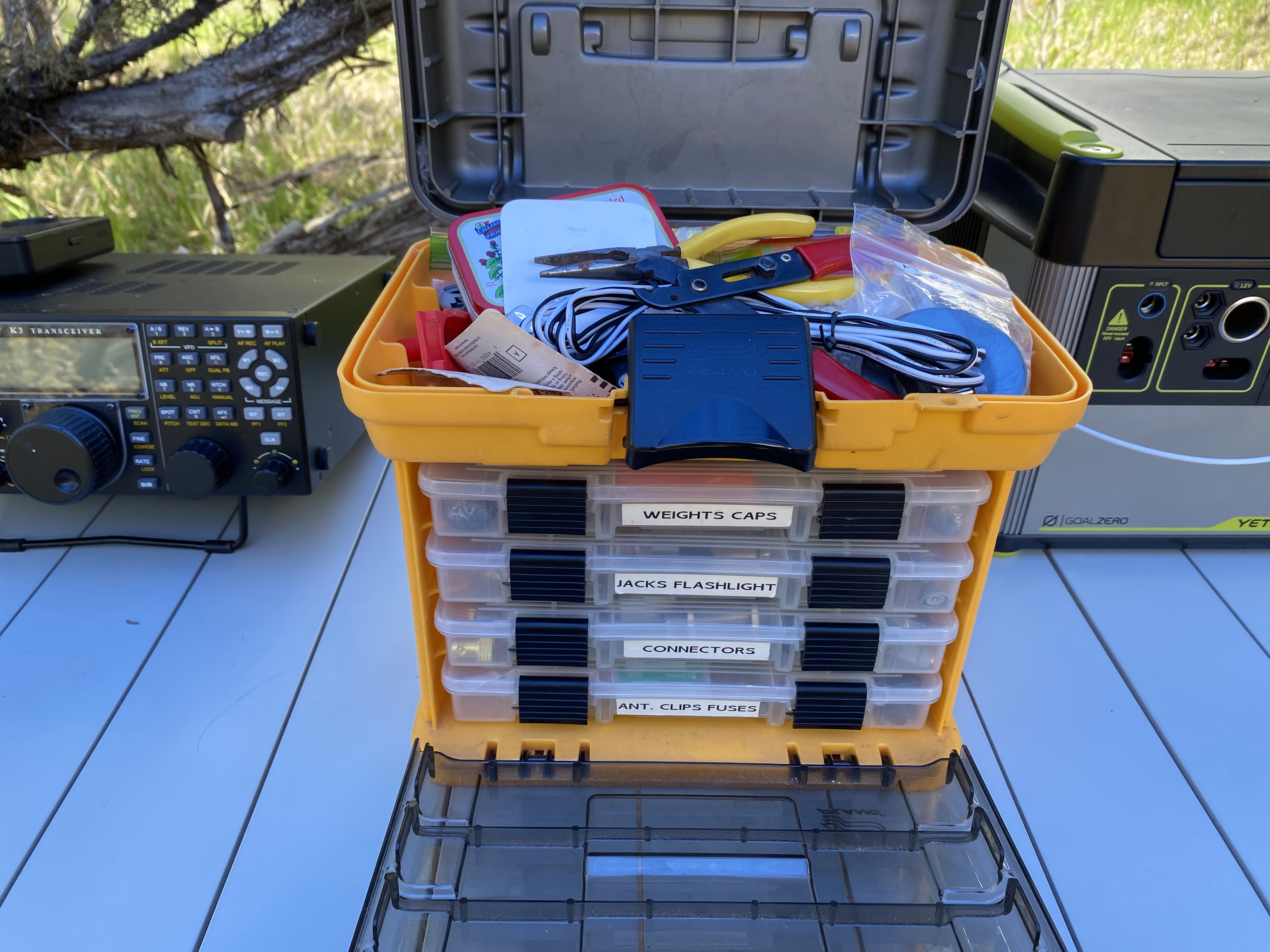 The the last thing I carry is a case full of connectors, adapters, fuses, electrical tools, and anything else I can think of. I also have a toolbox with a Fluke multimeter, heat gun, soldering iron, electrical connectors, crimpers, cable ties, toroids, duct and electrical tape, heat-shrink tubing, a wrist rocket, wire, monofilament and 1.5 oz fishing weights. All this stuff is usually overkill but it fits in Whitedog the Tacoma. 😉