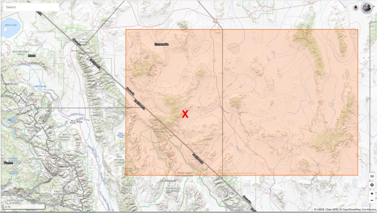 Sparsely populated maidenhead grid square DM17 straddles the Nevada/California border and is home to the infamous Area 51. The red X is Magruder Peak in the Palmetto Mountains were I plan to set up with some good eastern exposures.