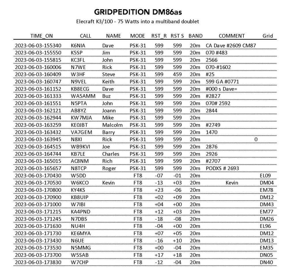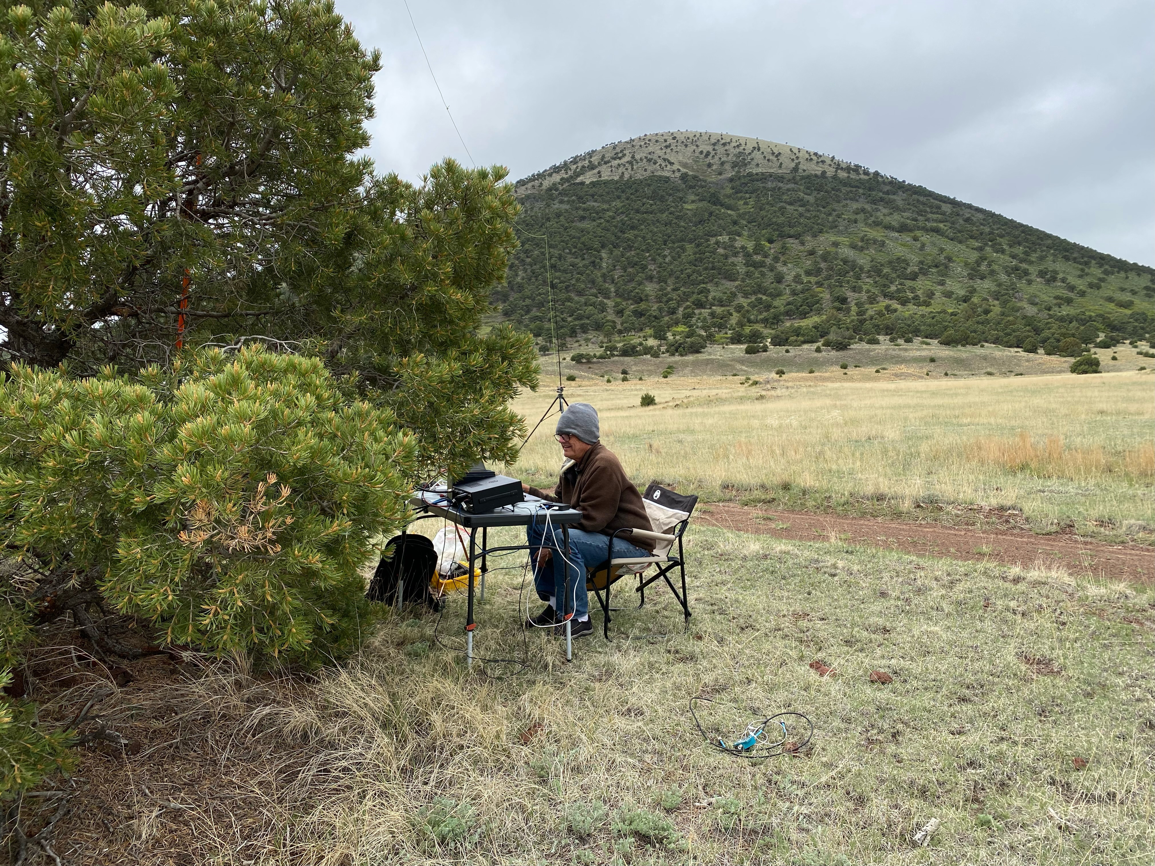 Things on a gridpedition always seem to have their bumps. The brand new doublet I made that was a good match on 40m was presenting very high SWR readings despite being thoroughly tested before we left. The cumulus clouds were building so I hurriedly switched to my older 20m version and it tuned up fine. (it later turned out to be a bad piece of coax and not the antenna).