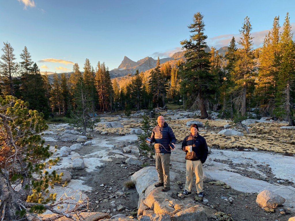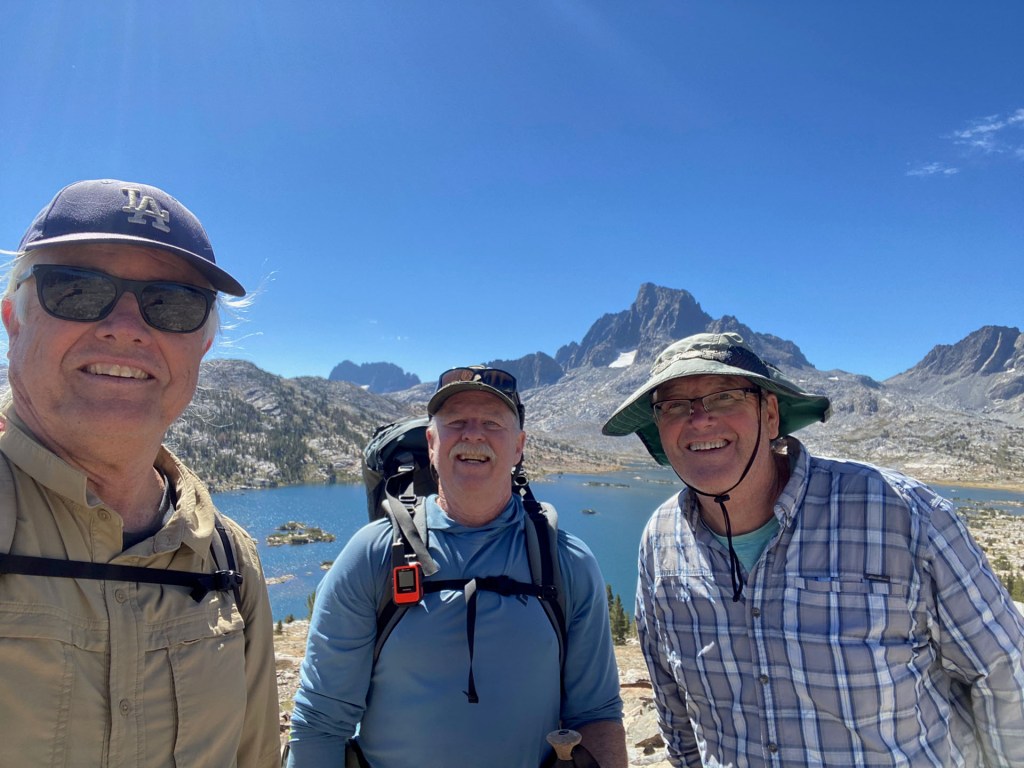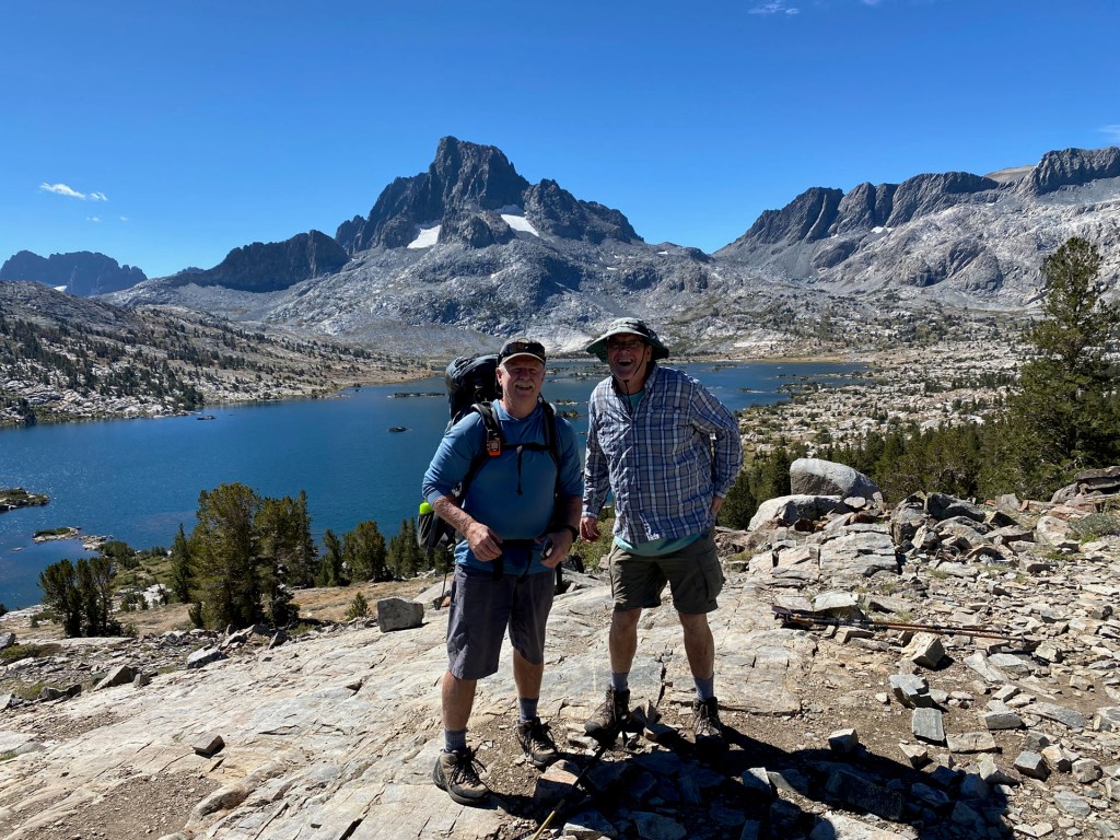 Sunset at our camp at Garnet LakeMy tent at Garnet lakeWater level at Thousand Island LakeMe, Steve and Bill in a selfie at Thousand Island LakeSteve Tennant and Bill Smith Thousand Isalnd LakeMt. Banner above Thousand Island LakeSecond night’s camp near the Marie Lakes turnoffSunrise on day 3Bill and Steve having the morning Via. I think that is Mount Banner behind themGarnet Lake from our third night’s camp.