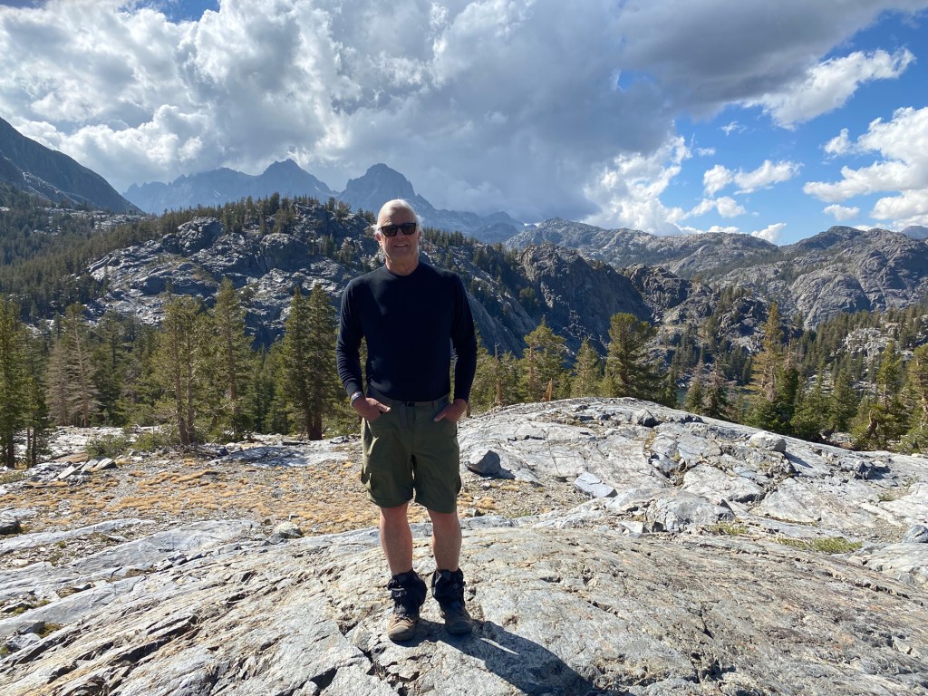 Bill doing water filtering chores at Gladys lakeLove this shot Steve took of me with Ritter and Banner Smokin Joe with Mammoth Mountain behindRitter and Banner with some weather staring to move inMy tent on our fourth night’s camp at Gladys LakeSteve and Bill lunch at Shadow LakeJust in case there was any doubt Steve points out the JMT sign at Garnet Lake as we start out on day 3Bill and Steve breaking camp at Garnet LakeAnother postcard of Mount Banner from Garnet Lake