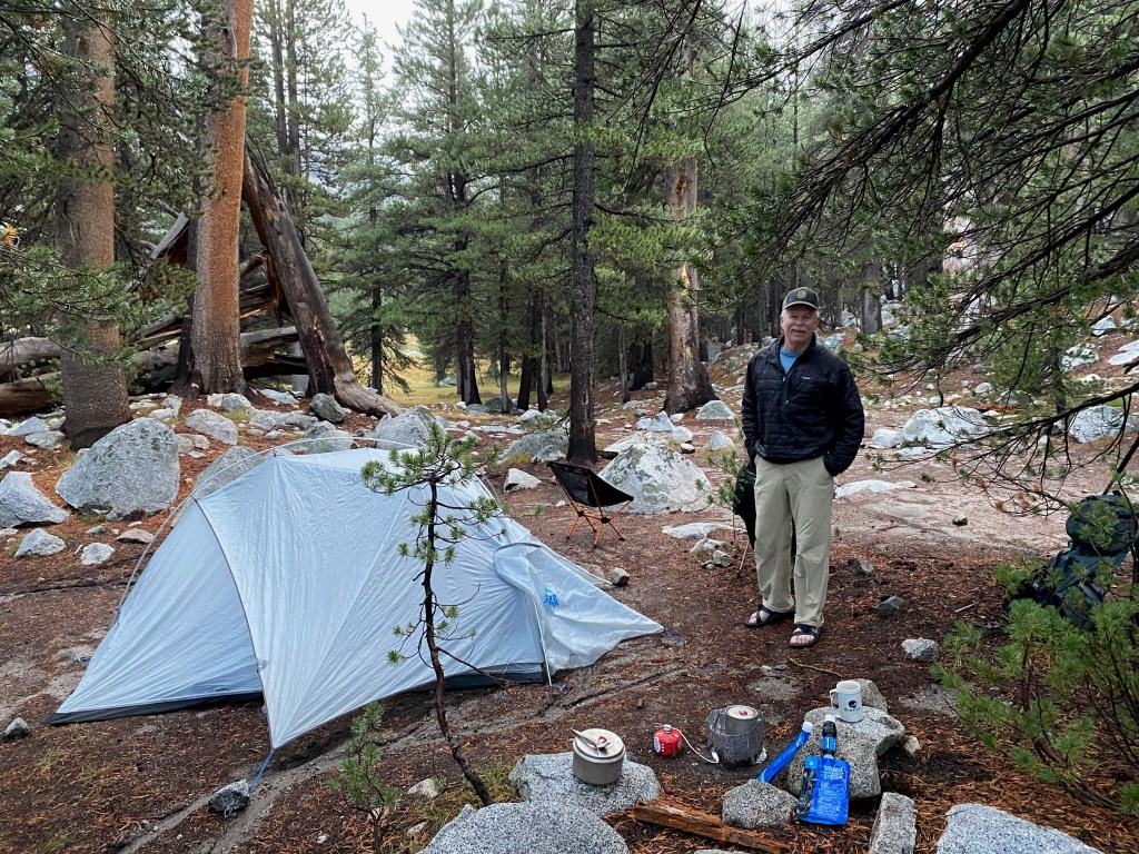 Trenching around my tent to lead the runoff awayBill had the misfortune of setting up his tent hereBill hangs out stuff to dry. Hs tent in the spot uphill.Steve and his tent weathered the downpour wellSome of the localsBill heading up Donohue Pass. “This pass is pissing me off” Steve TennantBill at a water crossing below Donohue PassTimberline tarnsBill is much happier going downhillSteve “Smokin’ Joe” Tennant in the glorious country beyond Donohue Pass. I could still smell some smoke but it was clearing out fast.