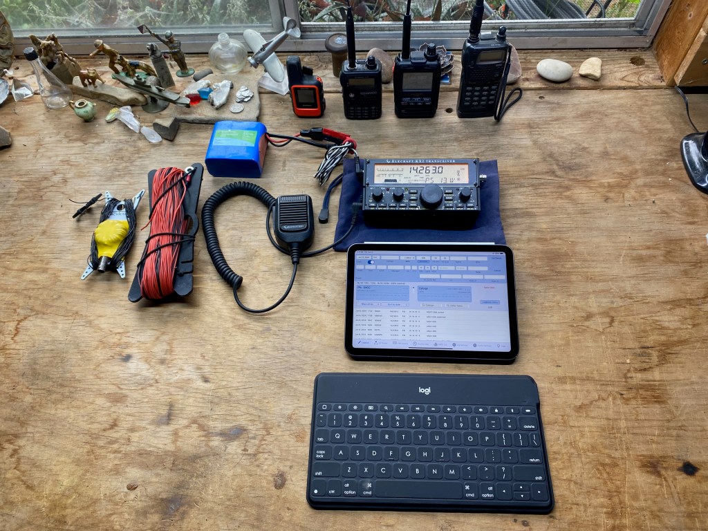 The SOTA station incorporates an Elecraft KX2 with a Bioenno 3AH external battery. My main SOTA antenna is a home brew 20 AWG zip cord doublet that is resonate on 40m. I also carry a PackTenna end-fed random wire antenna for quick deployment in tough conditions. For 2m and 70cm I use a Kenwood TH-F6a and a roll-up Slim Jim. Recently I’ve added a Yaesu FT5DR and APRS capability. The antennas are supported with a Goture 20′ carbon fiber fishing pole, a Jackite 30′ and a Jackite 20′ fiberglass masts. Also pictured is the first radio I ever owned after I got my license in 2002 — an ICOM IC-T7H. I used this radio exclusively on my first few activations
