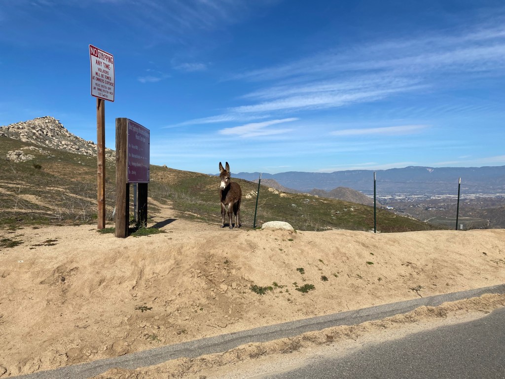 The park opens at 7am I got there just at 7 and was the first car there. As I drove up Pigeon Pass Road I spotted a warning sign that had the picture of a donkey on it. Weird, I thought.