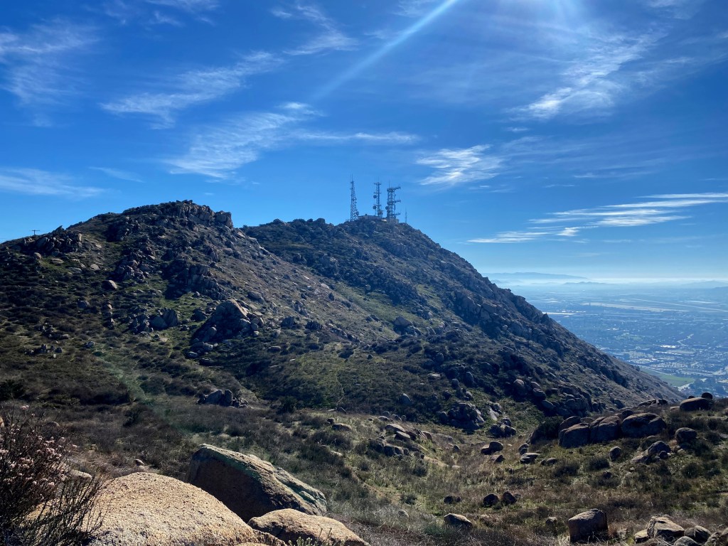 Despite the heavy RF environment due to a massive, unlovely communications complex, I give this one two stars due to the interesting hike up and unusual view. You can do it from a trailhead off Hidden Springs Drive that is a bit longer with more elevation gain, or you can do what I did and go from the Box Springs Mountain Reserve trailhead at the end of Pigeon Pass Road.