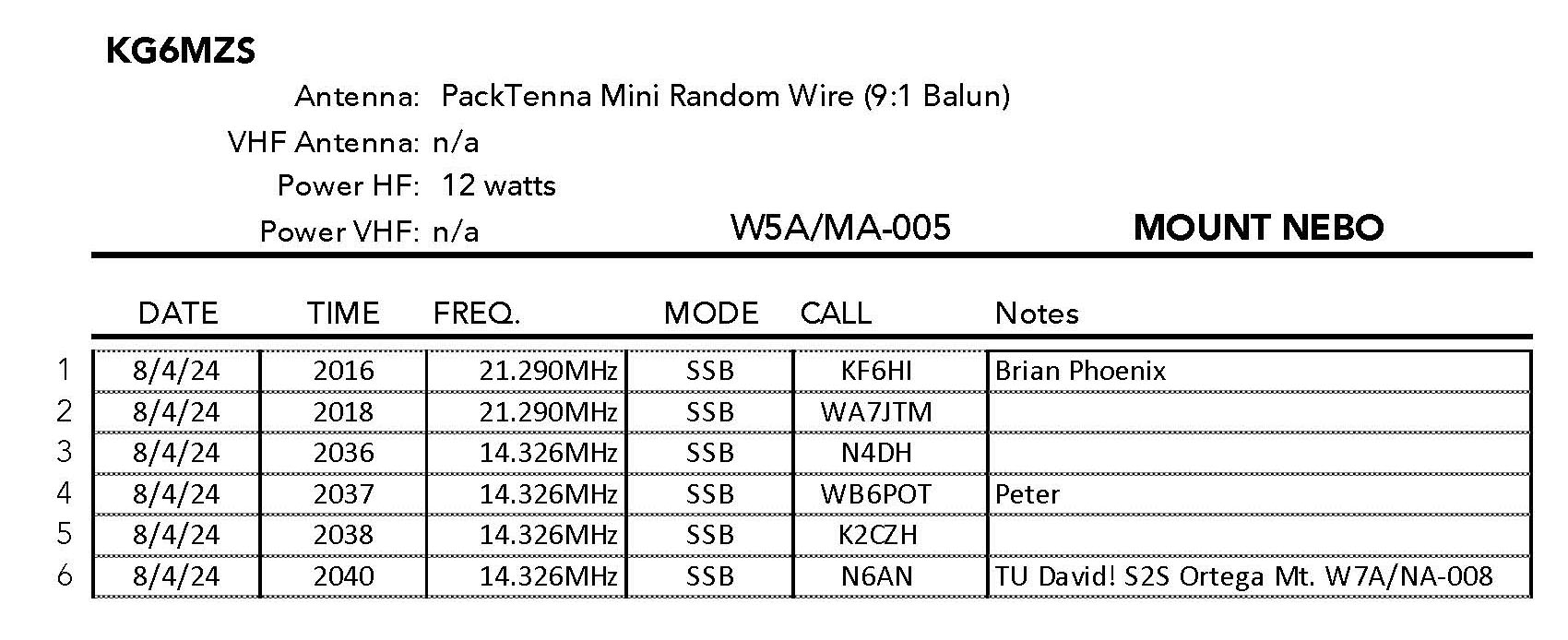 After the eclipse we figured we would let the crowd thin out and file down the steep “crooked” road that is the only way in and out of Mount Nebo State Park. Band conditions we very poor and I accidentally left my Yeti 1500 AC power inverter on for a portion of the activation. This added a lot (s9) noise to several bands. 10m was completely dead. Not wanting to drag the activation out in consideration of my crew, I only made 6 contacts. The icing on the cake of a wonderful day was catching David N6AN on Ortega Mountain in Arizona for a summit-to-summit.